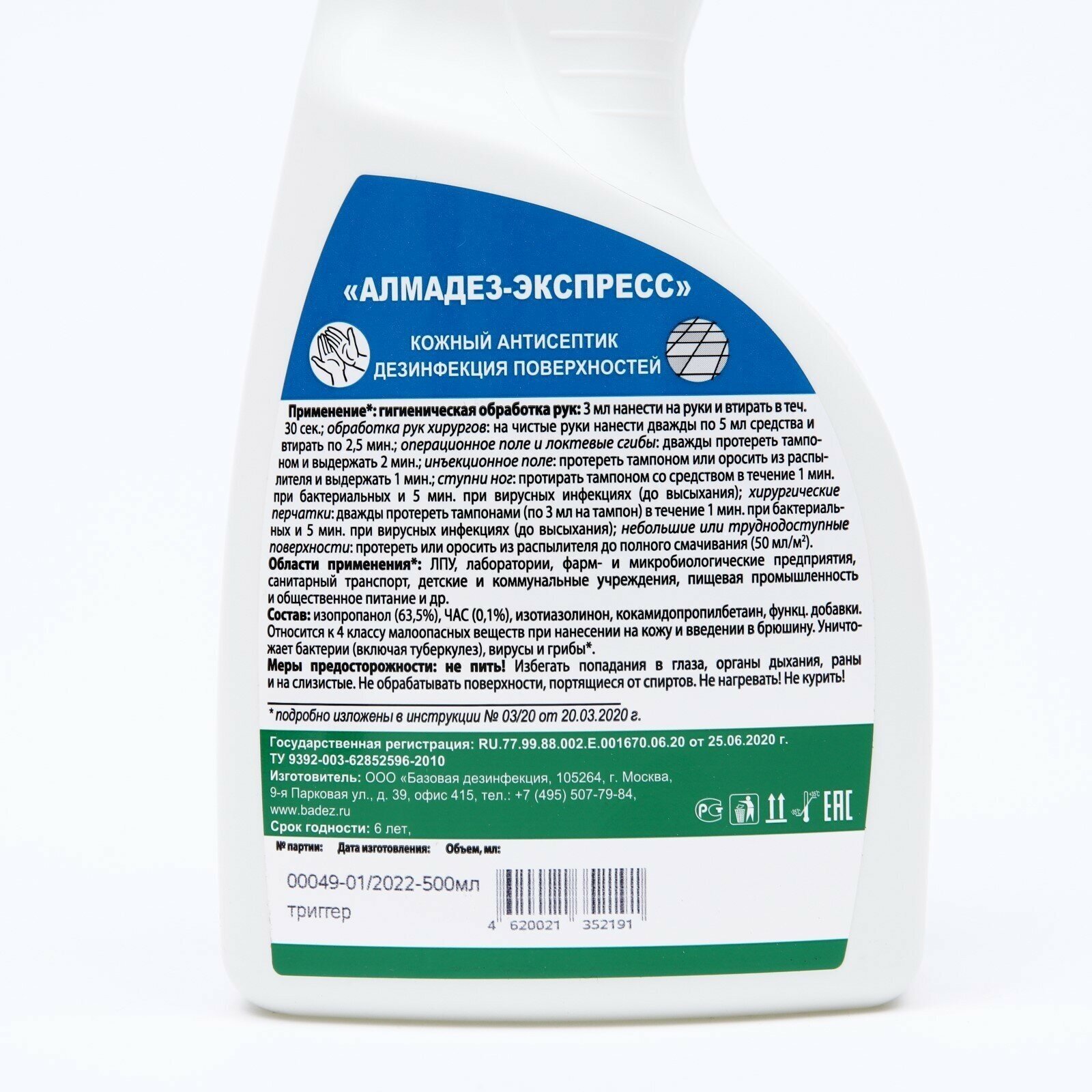 Состав: В качестве действующих веществ содержит: изопропиловый спирт (2-пропанол) — 63,5% и алкилдиметилбензиламмоний хлорид — 0,1%, а также функциональные добавки.