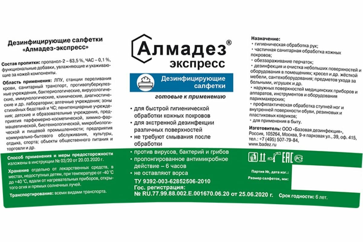 Алмадез-Экспресс представляет собой готовые к применению салфетки различных размеров и разной плотности белого цвета из нетканого материала и равномерно пропитанные дезинфицирующим средством.
