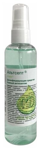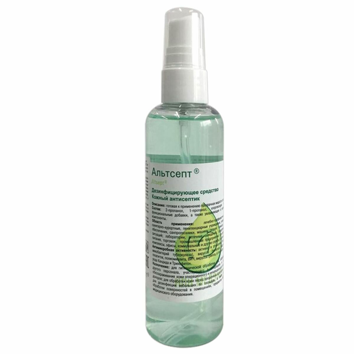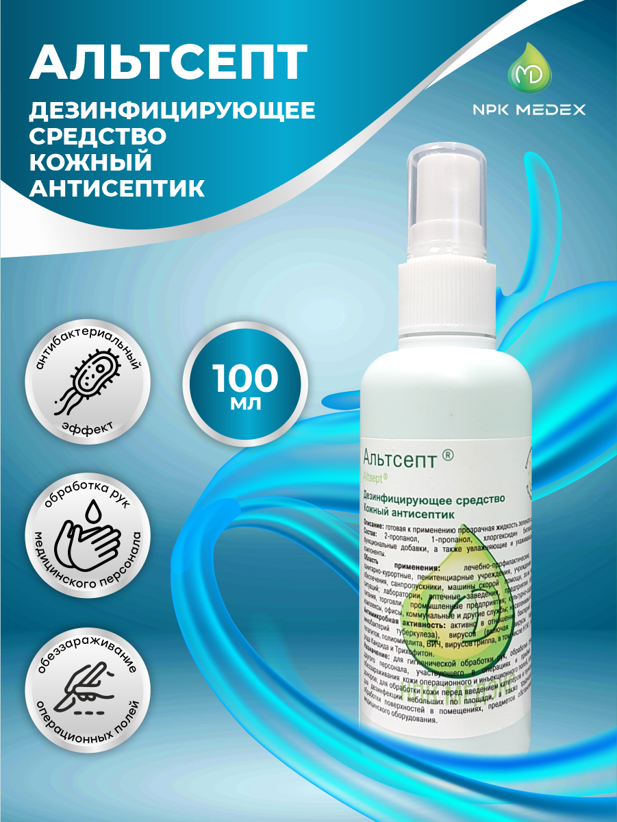 Дезинфицирующее средство (кожный антисептик) «Альтсепт» предназначено для:- гигиенической обработки рук медицинского персонала лечебно-профилактическихучреждений (ЛПУ), станций скорой медицинской помощи, работников лабораторий (в том числе бактериологических, вирусологических, иммунологических, клинических и прочих), аптечных заведений;- обработки рук хирургов, операционных медицинских сестер, акушерок и других лиц,участвующих в проведении операций, приеме родов;- обработки локтевых сгибов доноров;- обработки кожи операционных и инъекционных полей пациентов в ЛПУ, медицинскихкабинетах различных учреждений, а также в условиях транспортировки в машинах скоройпомощи и при чрезвычайных ситуациях;- гигиенической обработки рук медицинских работников детских дошкольных ишкольных учреждений, учреждений соцобеспечения (дома престарелых, инвалидов и др.);- работников парфюмерно-косметических предприятий и объектов общественного питания;- торговли, служащих объектов коммунальных служб (в том числе косметических салонов,парикмахерских и др.) и гостиничного хозяйства;- дезинфекции небольших по площади и труднодоступных поверхностей (столы,аппаратура, подлокотники кресел, ручки дверные и т.п.) в ЛПУ, на коммунальных объектах, в учреждениях соцобеспечения; на парфюмерно-косметических предприятиях, на объектах общественного питания способами протирания и орошения при инфекциях бактериальной (включая туберкулез), грибковой и вирусной этиологии;- для применения населением в быту (гигиеническая обработка рук, обеззараживаниекожи инъекционного поля; дезинфекция небольших по площади, а также труднодоступных для обработки поверхностей в помещениях, предметов обстановки) - строго в соответствии с этикеткой для быта.