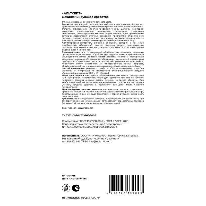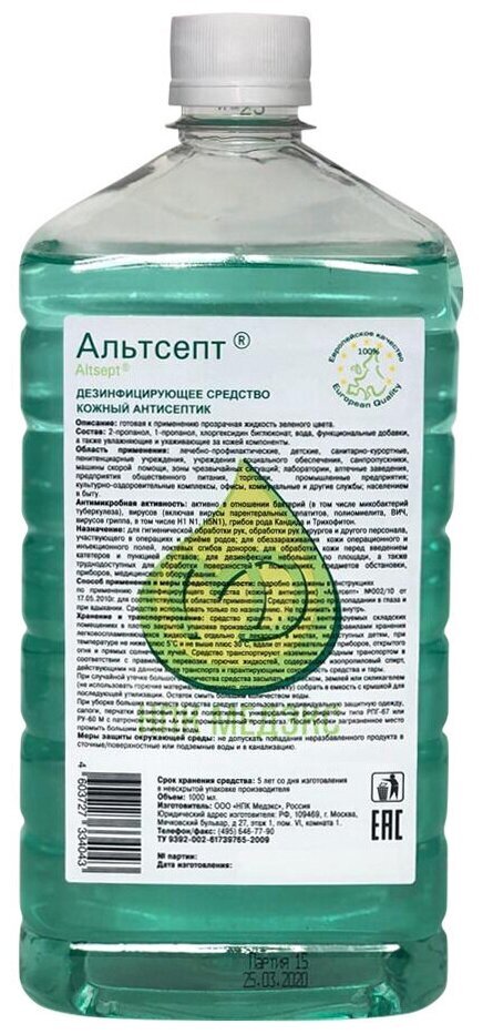 Готовая к применению прозрачная жидкость от светло-зеленого до зеленого цвета, для обработки рук и поверхностей. Обладает пролонгированным действием в течение 5 часов, в том числе при обработке рук хирургов. Быстро высыхает, не оставляет следов на поверхностях, не используется для обработки поверхностей, покрытых лаком, низкосортными красками, из акрилового стекла и других материалов, не устойчивых к воздействию спиртов. Легко воспламеняется. СФЕРА ПРИМЕНЕНИЯ: ЛПУ, клинические лаборатории, станции переливания крови, бактериологические лаборатории, детские учреждения (детсады, школы и т.п.), предприятия общественного питания, предприятия продовольственной торговли, коммунальные объекты (бани, бассейны, гостиницы, общественные туалеты и т.п.), санитарный транспорт, в быту населением, аптеки, вирусологические лаборатории. СОСТАВ: Изопропиловый спирт - 50%, пропиловый спирт - 20% и хлоргексидина биглюконат - 0.5%, а также функциональные компоненты.
