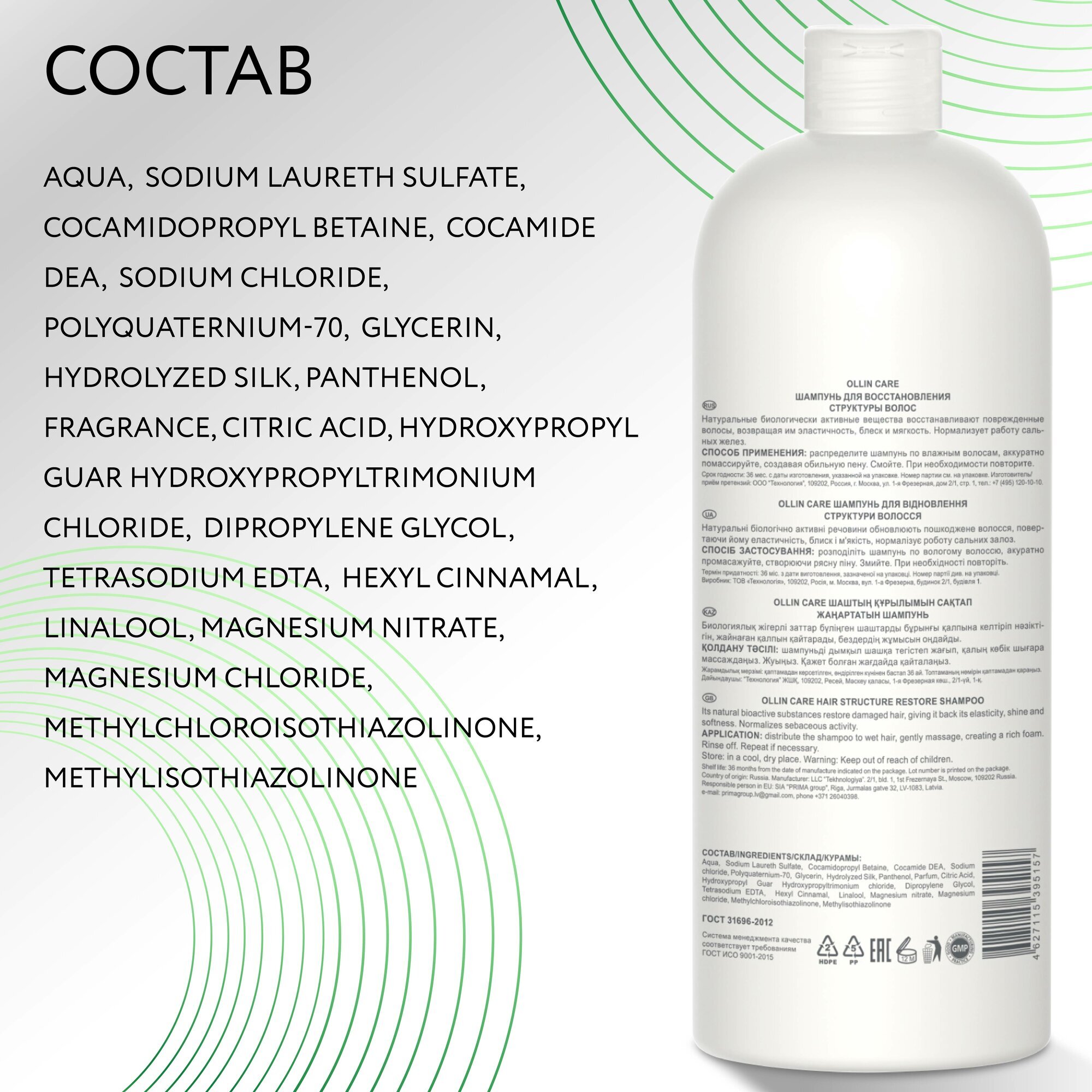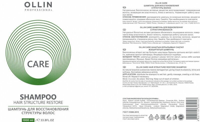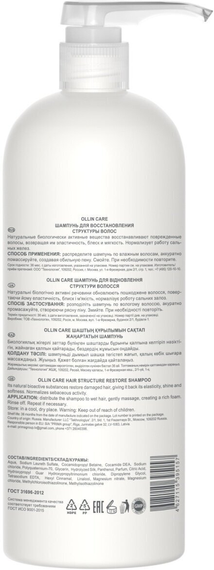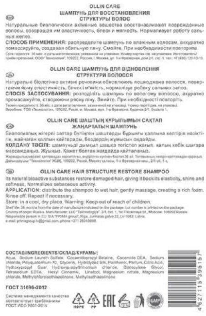 Шампунь OLLIN Professional CARE для восстановления структуры волос – эффективное средство, которое вернет вашим локонам здоровье и жизненную силу. Продукт производится брендом Ollin Professional, известным своими качественными косметическими средствами для ухода за волосами.