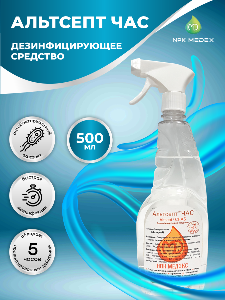 Дезинфицирующее средство Альтсепт ЧАС со спреем 0,5л - это продукт от НПК Медэкс, компании, зарекомендовавшей себя на рынке дезинфицирующих средств.