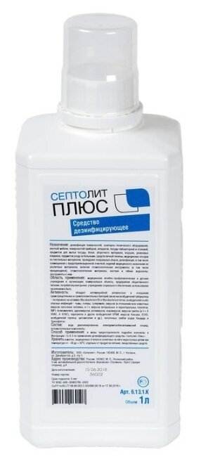 Септолит Плюс - это экономичное дезинфицирующее средство, которое широко применяется для дезинфекции различных поверхностей и обладает отличными моющими свойствами. Дезинфицирующее средство предназначено для очистки и дезинфекции поверхностей в помещениях, жесткой мебели, поверхностей приборов и оборудования, а также для дезинфекции инструментов в парикмахерских, массажных, косметических салонов. Септолит-Плюс обладает антимикробной активностью в отношении грамположительных и грамотрицательных бактерий (включая микобактерии туберкулеза), различных вирусов (включая гепатит А) и грибов рода Кандида и Дерматофитон.