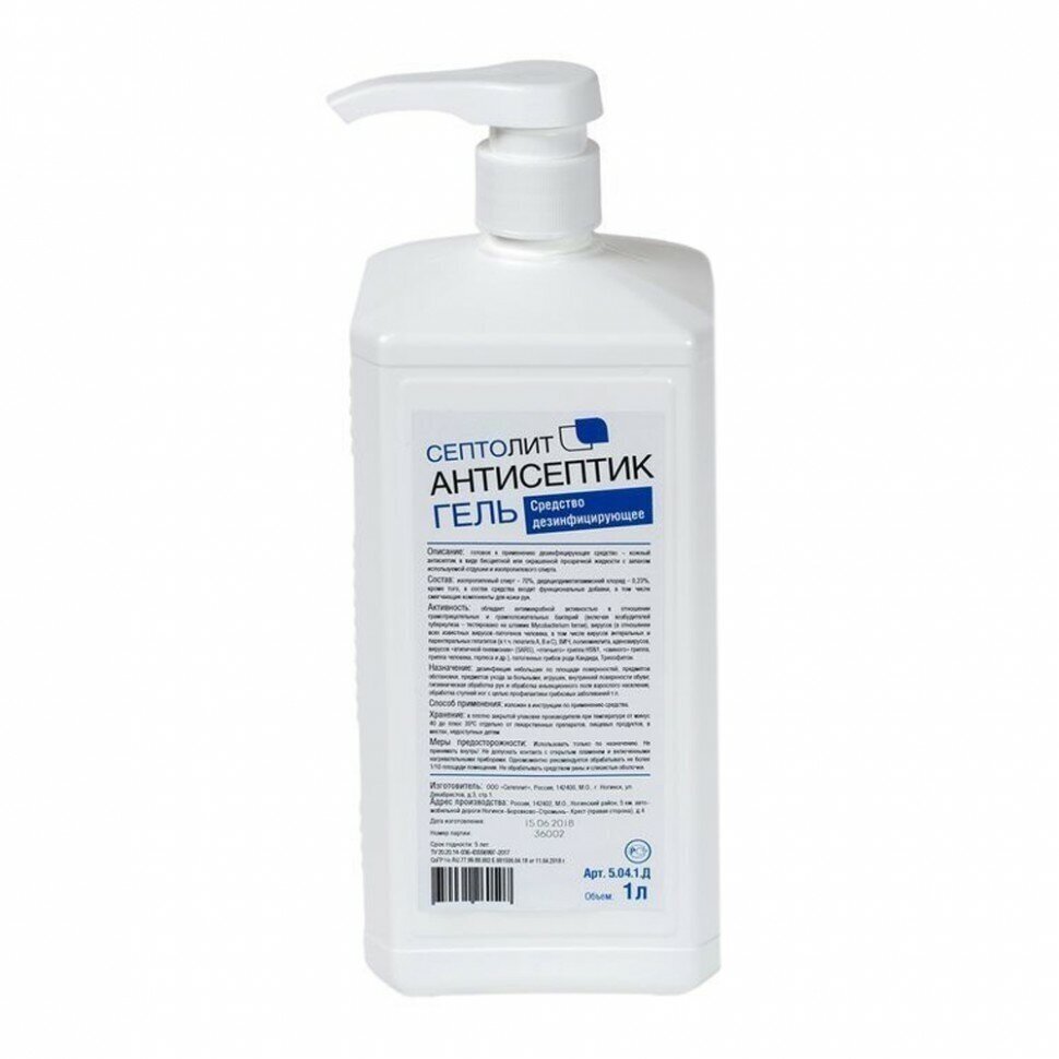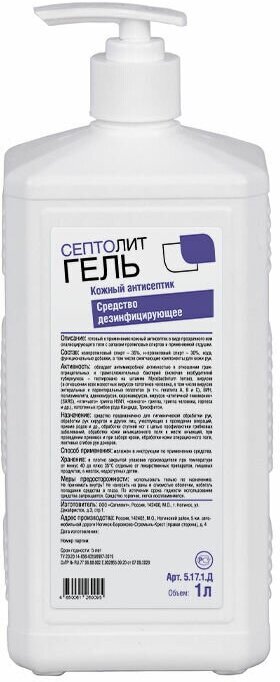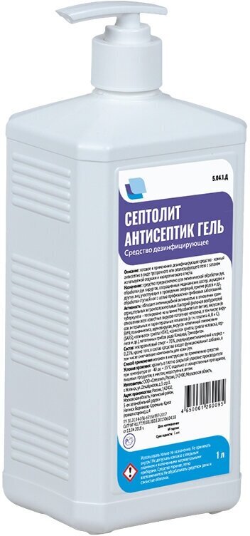 Средство дезинфицирующее Септолит-антисептик - готовое к применению средство для обработки рук в виде геля. Действующие вещества - изопропиловый спирт (70%), содержит ЧАС в качестве синергетической добавки для пролонгированного действия. Выпускается в различных видах фасовки.