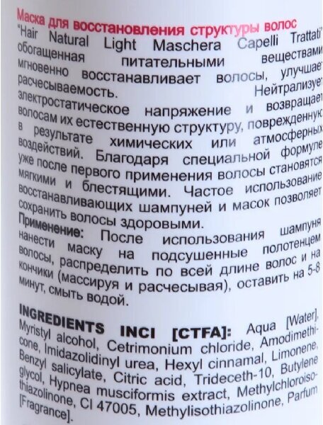 Сбалансированный состав маски содержит различные питательные и увлажняющие компоненты, которые обеспечивают восстановление и защиту волос.
