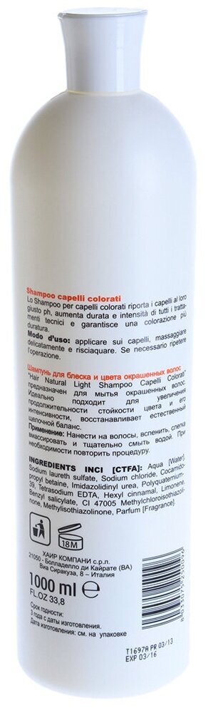 Шампунь для блеска и цвета окрашенных волос Hair Company Hair Natural Light Shampoo Capelli Colorati объемом 1000 мл предназначен для ежедневного использования и подходит для всех типов волос.