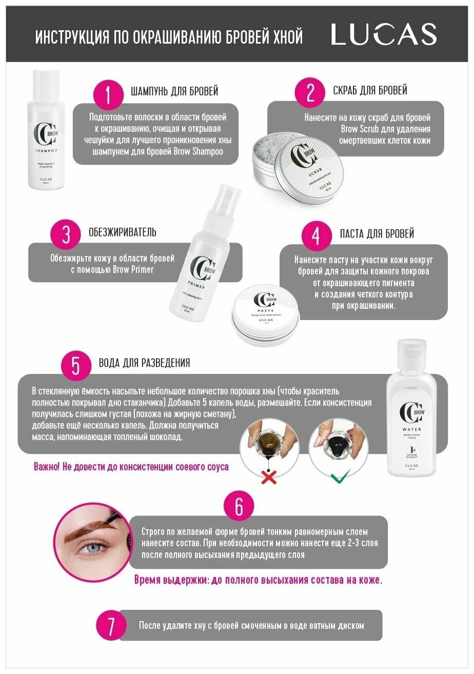Cмешать необходимое количество хны с теплой водой, до образования пастообразной массы. Наносить строго по контуру бровей. Экспозиция от 20-60 мин. Только для наружного применения. За 24 часа до применения необходимо сделать тест на аллергическую реакцию.