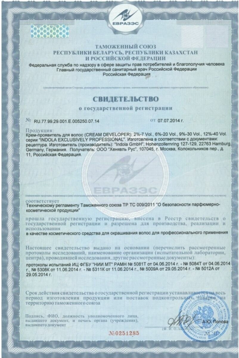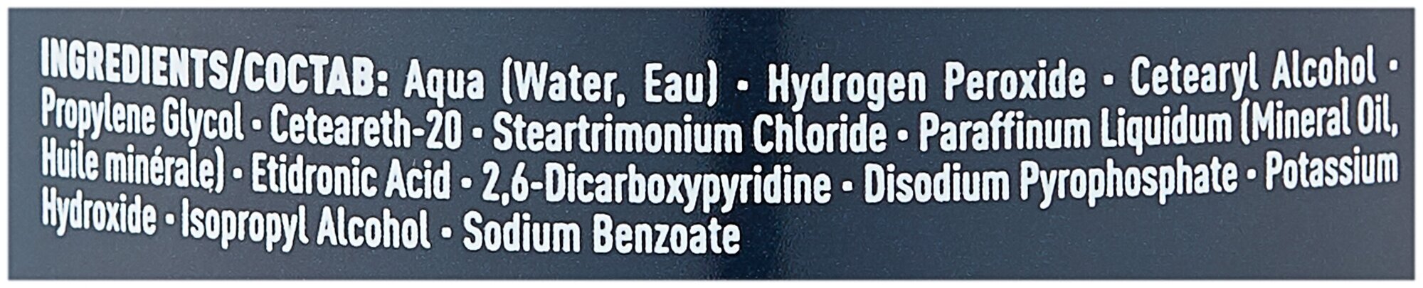 Состав: aqua (water, eau), hydrogen peroxide, cetearyl alcohol, propylene glycol, ceteareth-20, steartrimonium chloride, paraffinum liquidum (mineral oil, huile minerale), etidronic acid, 2,6-dicarboxypyridine, disodium pyrophosphate, potassium hydroxide, isopropyl alcohol, sodium benzoate