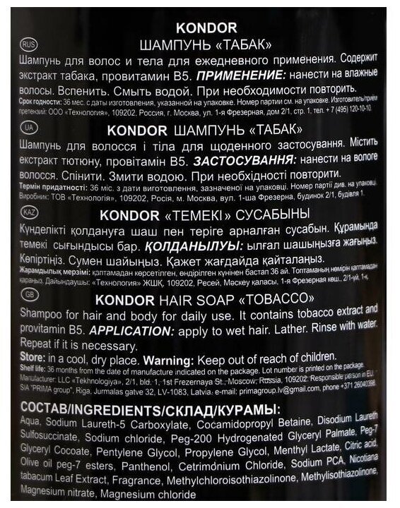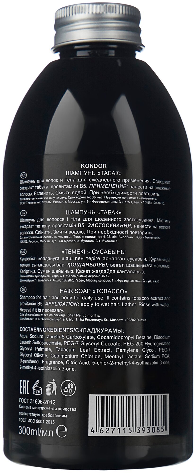 Kondor - это испанский бренд, который зарекомендовал себя на рынке профессиональной косметики. Шампунь Hair&Body Табак - это еще одно доказательство высокого качества и эффективности продукции этого бренда.