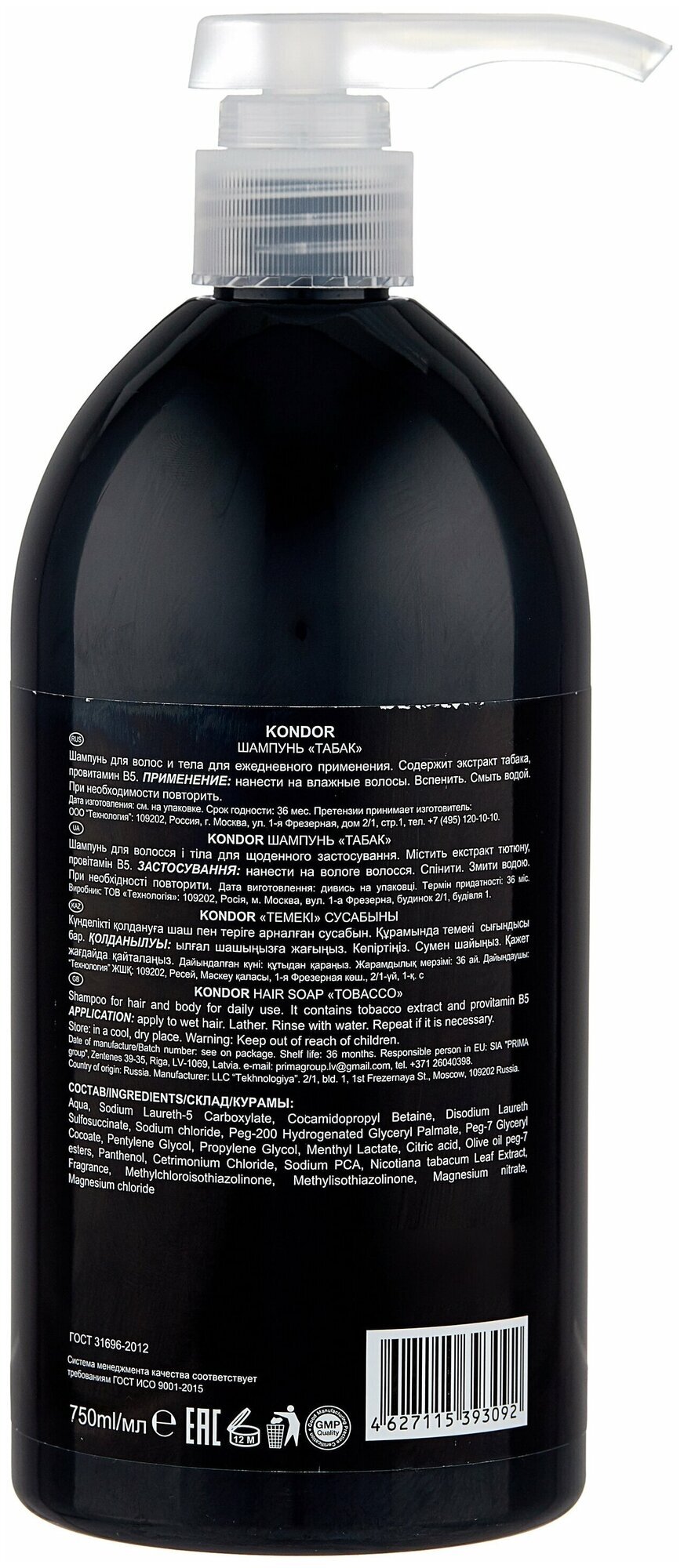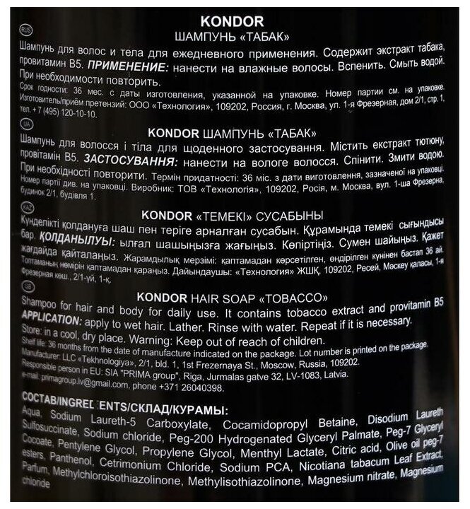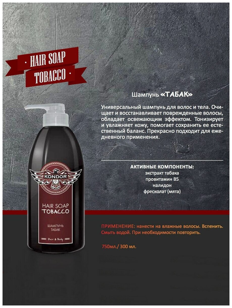 В целом, шампунь Kondor Hair&Body "Табак" - это надежное и эффективное средство для ухода за волосами и телом, которое обеспечивает глубокое очищение, восстановление и увлажнение, а также тонизирование и увлажнение кожи.