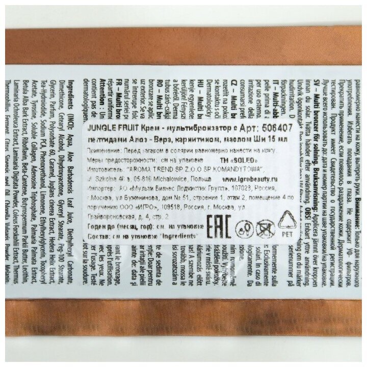 Крем для загара SOLEO JUNGLE FRUIT 15 мл производится в Польше и является профессиональным средством для автозагара и солярия.