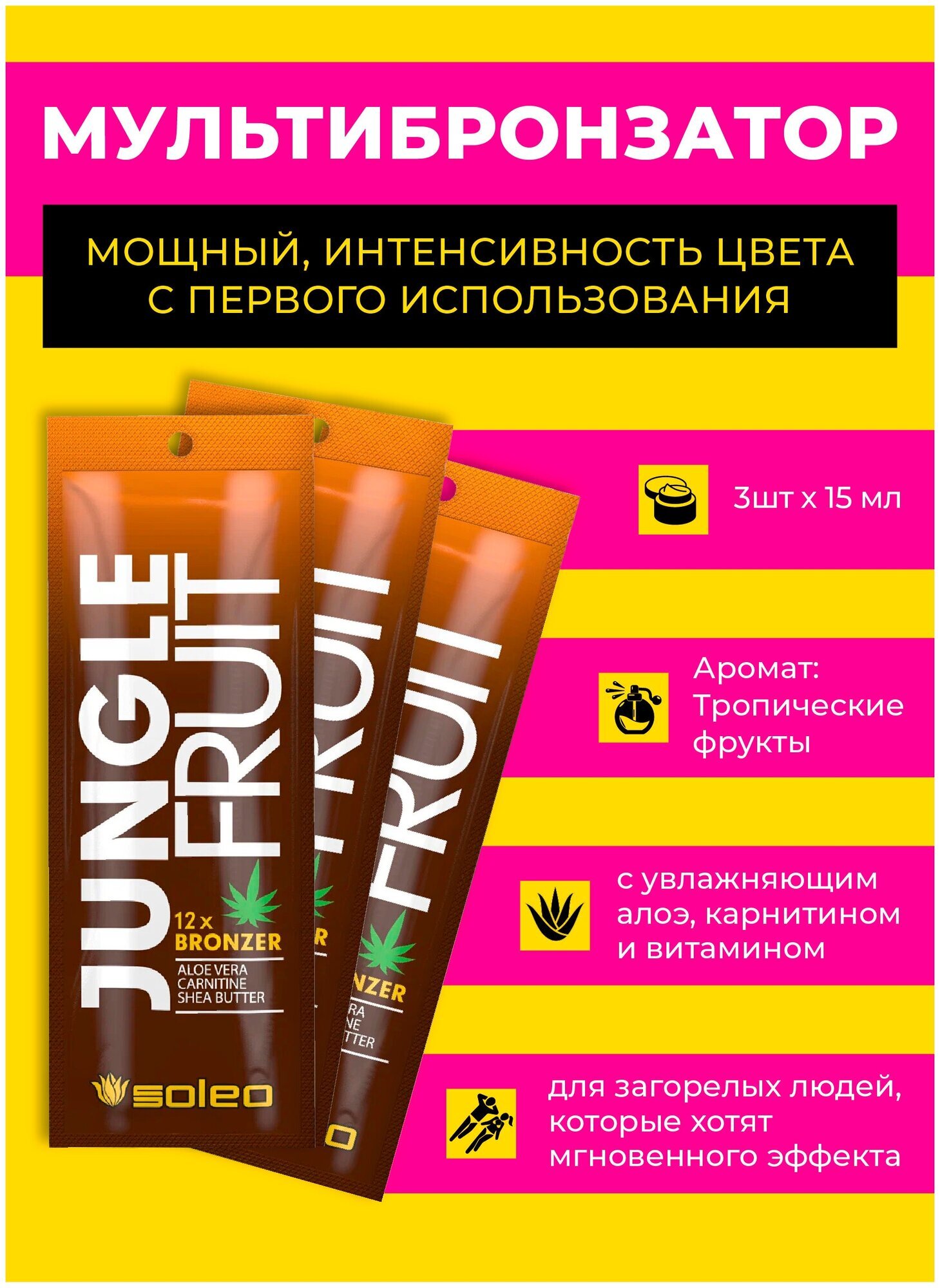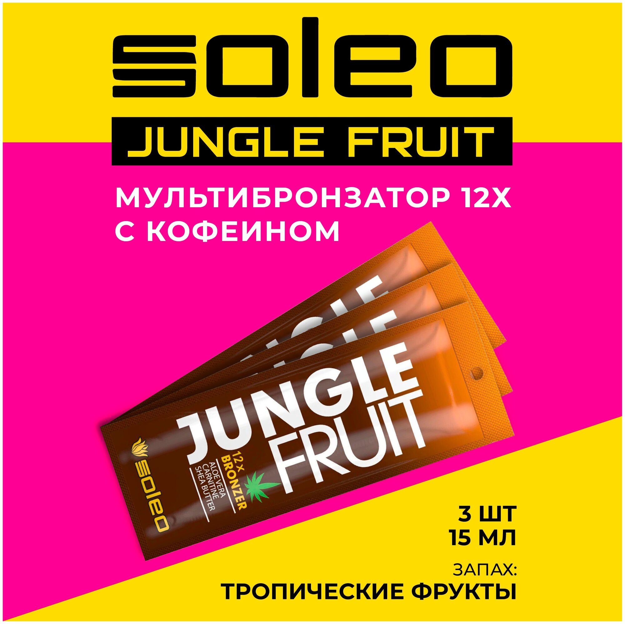 Крем для загара SOLEO JUNGLE FRUIT 15 мл - это профессиональное средство для автозагара и солярия, которое обеспечивает интенсивный и стойкий загар.