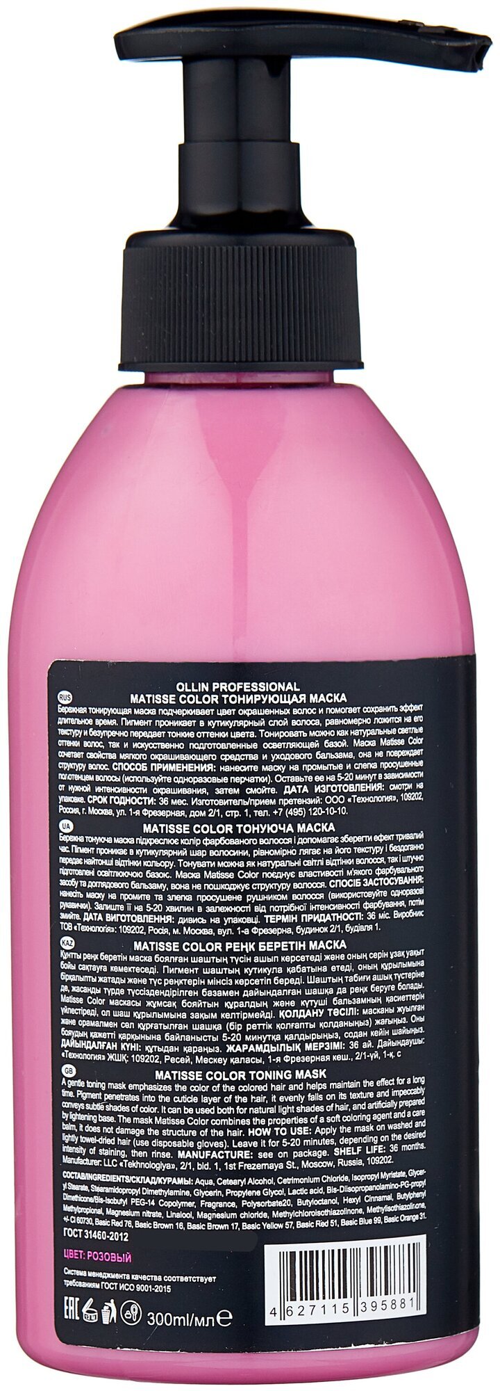 Тонирующая маска MATISSE COLOR РОЗОВЫЙ 300мл от OLLIN Professional - это профессиональное средство для ухода за окрашенными волосами. Созданная в России, эта маска обеспечивает бережное тонирование и поддержание насыщенности цвета на протяжении нескольких недель.