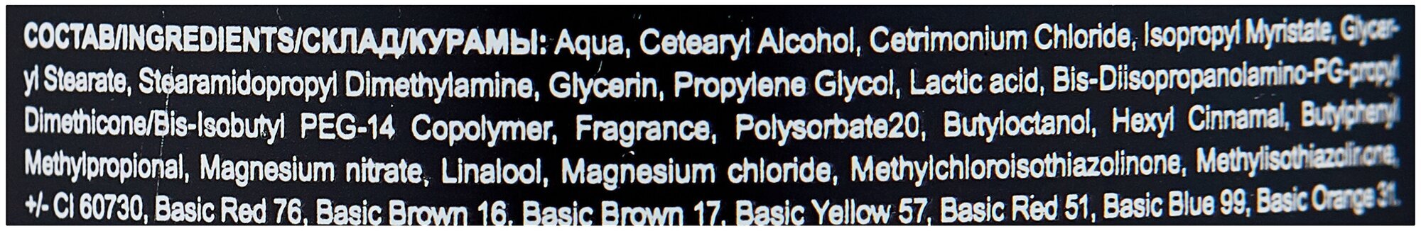 Благодаря активным ингредиентам, таким как цетримониум хлорид, глицерин и молочная кислота, маска не повреждает структуру волос, обеспечивая защиту цвета и придание блеска.