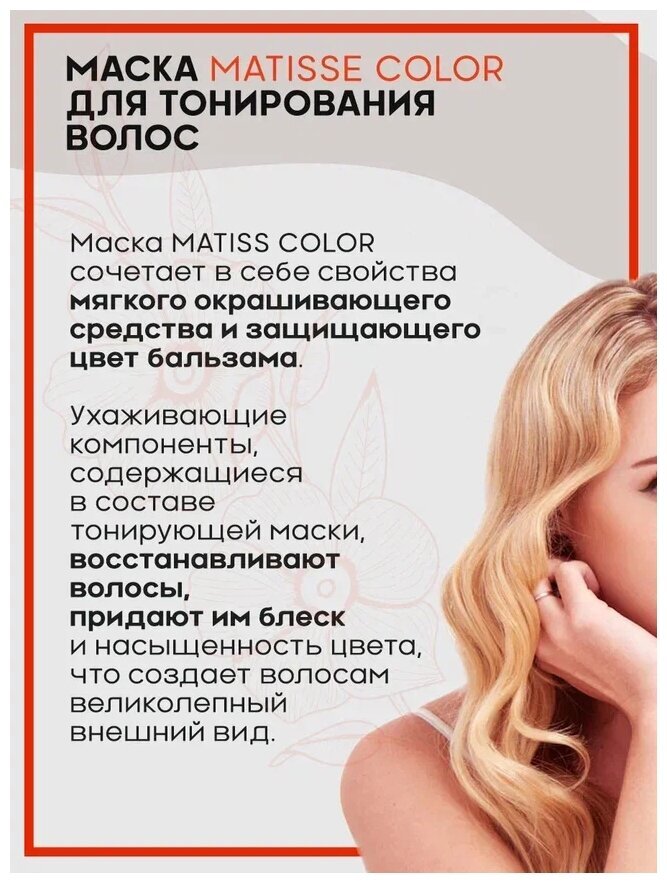 MATISSE COLOR подходит для всех типов волос, включая натуральные светлые оттенки и искусственно подготовленные осветляющей базой. Допустимо использовать для оттенков, начинающихся с 8,9 и 10 глубины тона.