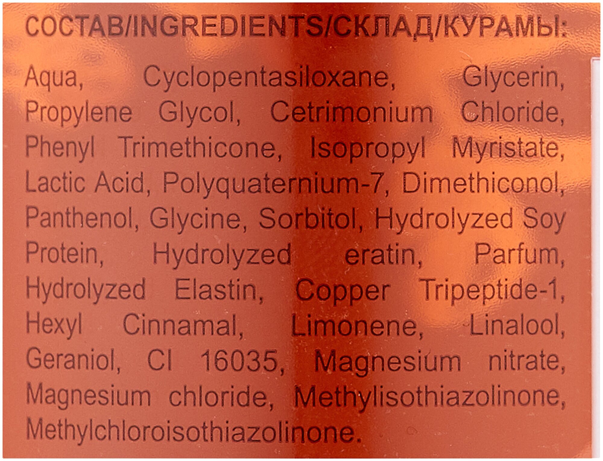 Активные компоненты двухфазного спрея-кондиционера включают кератин, который сглаживает и защищает волосы от внешних факторов, а также омега СН-активатор и гидролизованный эластин, которые питают луковицы волос и увлажняют волосы.