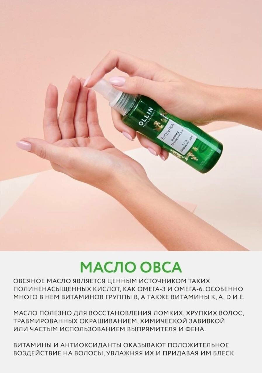 Флюид для волос от бренда OLLIN PROFESSIONAL - это средство для ухода за волосами, которое поможет вернуть им здоровье и красоту. Средство содержит масло овса и комплекс витаминов, которые питают и увлажняют волосы, делают их мягкими и блестящими. Флюид легко наносится на волосы и не требует смывания. Он подходит для ежедневного применения и защищает волосы от УФ-лучей.
