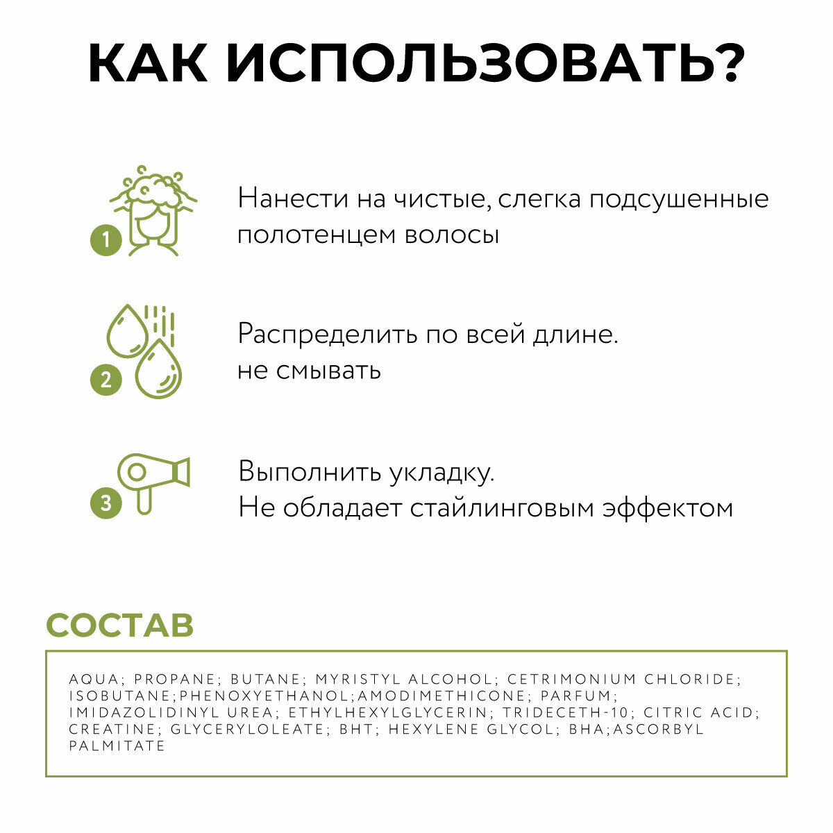 Активные ингредиенты, такие как креатин и цетримониум хлорид, помогают восстановить межклеточные связи, сгладить кутикулу и придают волосам блеск и мягкость.