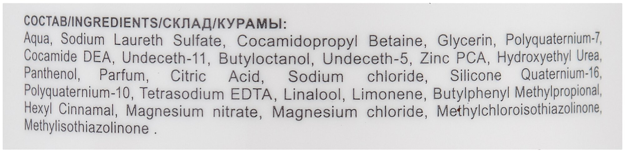Aqua, Sodium Laureth Sulfate, Cocamidopropyl Betaine, Glycerin, Polyquaternium-7, Cocamide DEA, Undeceth-11, Butyloctanol, Undeceth-5, Zinc PCA, Hydroxyethyl Urea, Panthenol, Parfum, Citric Acid, Sodium chloride, Silicone Quaternium-16, Polyquaternium-10, Tetrasodium EDTA, Linalool, Limonene, Butylphenyl Methylpropional, Hexyl Cinnamal, Magnesium nitrate, Magnesium chloride, Methylchloroisothiazolinone, Methylisothiazolinone