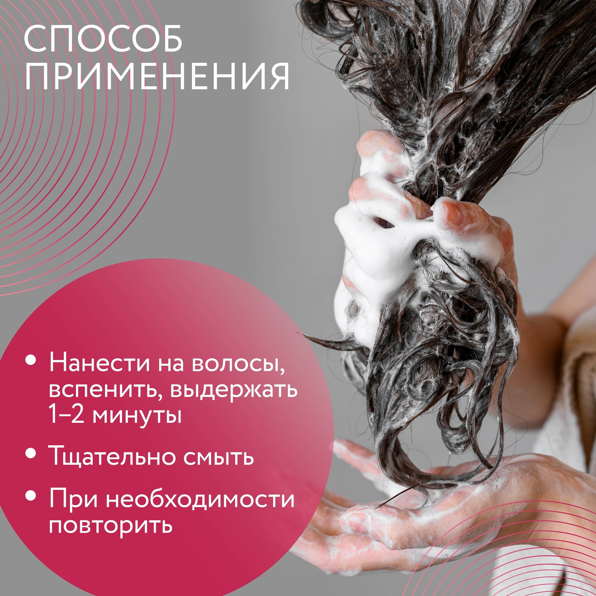 Способ применения шампуня прост и удобен: нанесите его на влажные волосы, вспеньте, оставьте на 1-2 минуты и тщательно смойте. При необходимости повторите процедуру.