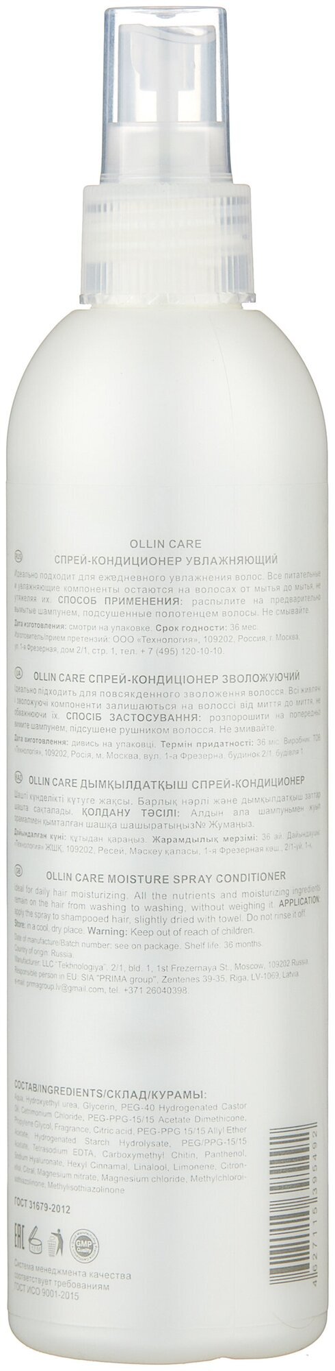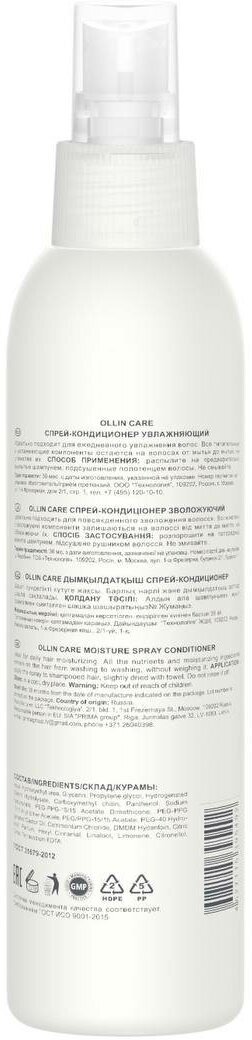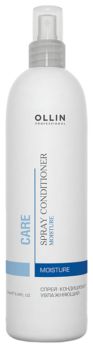 Спрей-кондиционер OLLIN Care Moisture Spray Conditioner — это идеальное средство для увлажнения и выравнивания сухих, нормальных, тонких и поврежденных волос. Он придает волосам блеск и облегчает расчесывание, а также обеспечивает термозащиту. Активный компонент гидрованс увлажняет и питает волосы, производные касторового масла укрепляют их структуру, а хитозан восстанавливает поврежденные участки. Объем спрея 250 мл позволяет использовать его ежедневно и не требует смывания. Спрей-кондиционер подходит для всех типов волос и кожи головы, а также для мужчин. Текстура спрея жидкая, что позволяет легко наносить его на волосы. Эффект от использования средства заключается в придании объема, разглаживании, уплотнении волос, придании блеска, облегчении расчесывания, увлажнении, питании, восстановлении и укреплении волос. Спрей не содержит искусственных красителей и парабенов. Его можно использовать для ежедневного применения и даже в качестве термозащиты. Способ применения очень прост: необходимо распылить спрей на предварительно вымытые и подсушенные полотенцем волосы, а затем не смывать его.