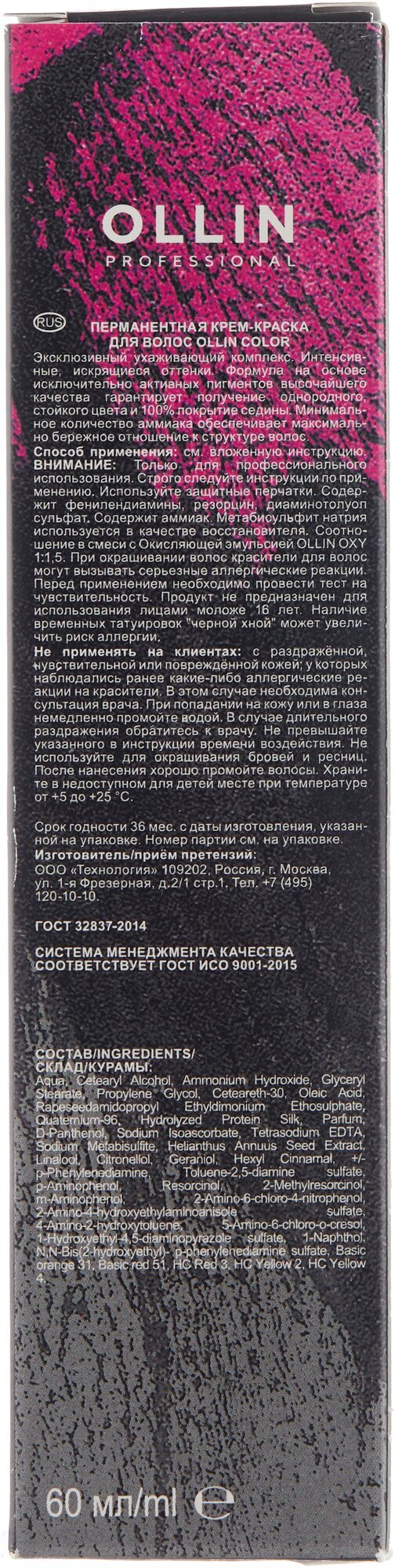 OLLIN COLOR Permanent Cream — перманентная крем-краска для создания интенсивных искрящихся оттенков. Формула красителя на основе исключительно активных пигментов высочайшего качества гарантирует получение однородного стойкого цвета и обеспечивает 100%-ное покрытие седины. Минимальное количество аммиака, содержащееся в красителе, обеспечивает бережное воздействие на структуру волос. Палитра Ollin Color содержит 101 оттенок. 80 тонов основной палитры, 10 тонов специальных блондинов, 6 микс-тонов (корректоров), 5 тонов Fashion Color.