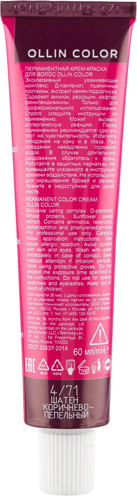 OLLIN COLOR 4/71 шатен коричнево-пепельный 60мл Перманентная крем-краска для волос