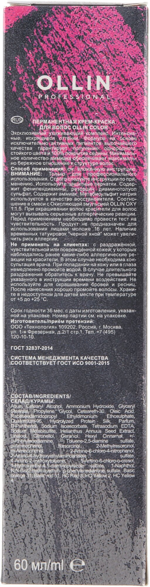 OLLIN COLOR Permanent Cream — перманентная крем-краска для создания интенсивных искрящихся оттенков. Формула красителя на основе исключительно активных пигментов высочайшего качества гарантирует получение однородного стойкого цвета и обеспечивает 100%-ное покрытие седины. Минимальное количество аммиака, содержащееся в красителе, обеспечивает бережное воздействие на структуру волос. Палитра Ollin Color содержит 101 оттенок. 80 тонов основной палитры, 10 тонов специальных блондинов, 6 микс-тонов (корректоров), 5 тонов Fashion Color.