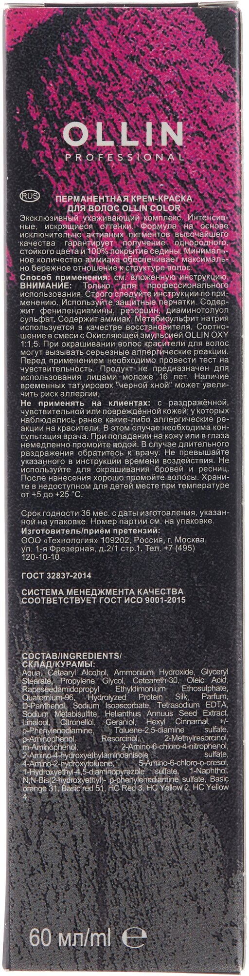 OLLIN COLOR Permanent Cream — перманентная крем-краска для создания интенсивных искрящихся оттенков. Формула красителя на основе исключительно активных пигментов высочайшего качества гарантирует получение однородного стойкого цвета и обеспечивает 100%-ное покрытие седины. Минимальное количество аммиака, содержащееся в красителе, обеспечивает бережное воздействие на структуру волос. Палитра Ollin Color содержит 101 оттенок. 80 тонов основной палитры, 10 тонов специальных блондинов, 6 микс-тонов (корректоров), 5 тонов Fashion Color.