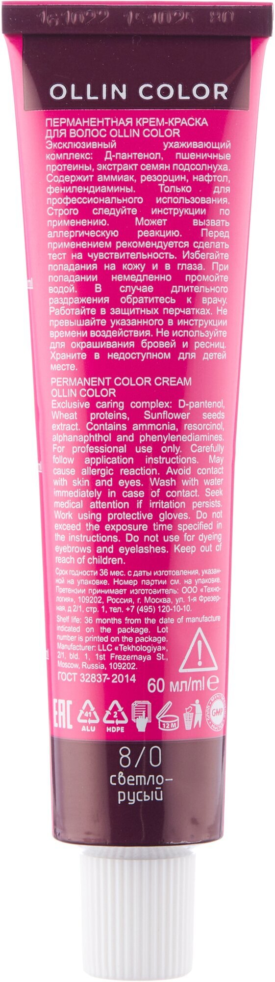Перманентная крем-краска для волос OLLIN COLOR 8/0 светло-русый 60мл