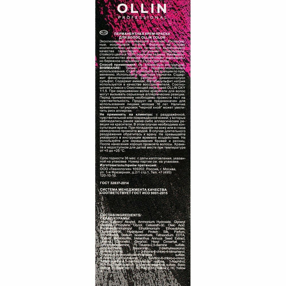 OLLIN COLOR Permanent Cream — перманентная крем-краска для создания интенсивных искрящихся оттенков. Формула красителя на основе исключительно активных пигментов высочайшего качества гарантирует получение однородного стойкого цвета и обеспечивает 100%-ное покрытие седины. Минимальное количество аммиака, содержащееся в красителе, обеспечивает бережное воздействие на структуру волос. Палитра Ollin Color содержит 101 оттенок. 80 тонов основной палитры, 10 тонов специальных блондинов, 6 микс-тонов (корректоров), 5 тонов Fashion Color.