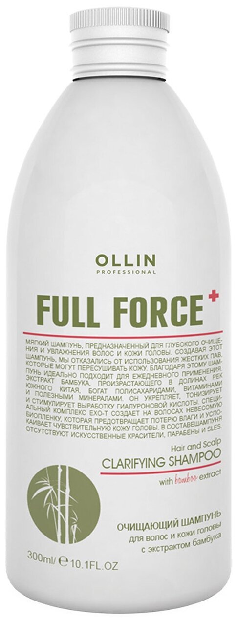 OLLIN FULL FORCE Очищающий шампунь с экстрактом бамбука обеспечивает глубокое очищение волос и кожи головы, не пересушивая их. Благодаря отсутствию в составе жестких ПАВ, шампунь увлажняет волосы и не вызывает раздражения кожи головы.