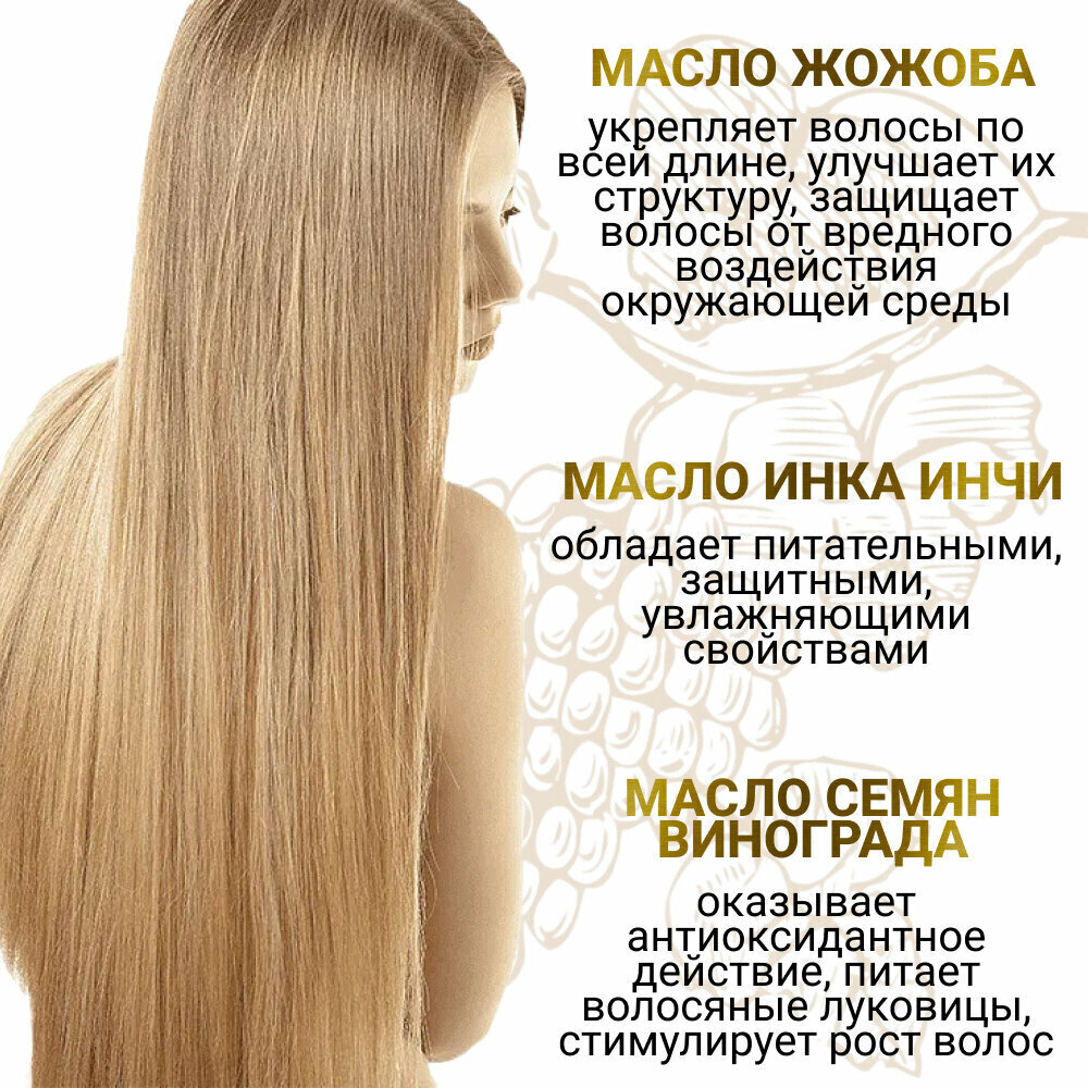 Масло содержит комплекс витаминов и масел, включая масло виноградной косточки, масло жожоба и масло инка-инчи. Эти активные ингредиенты обеспечивают питание, увлажнение, разглаживание и смягчение волос, а также придают им блеск и эластичность.