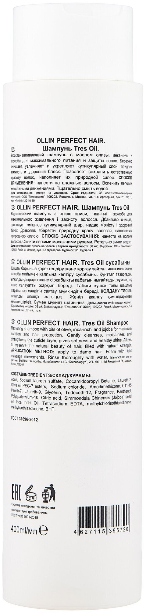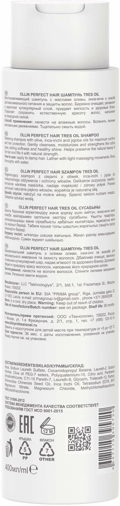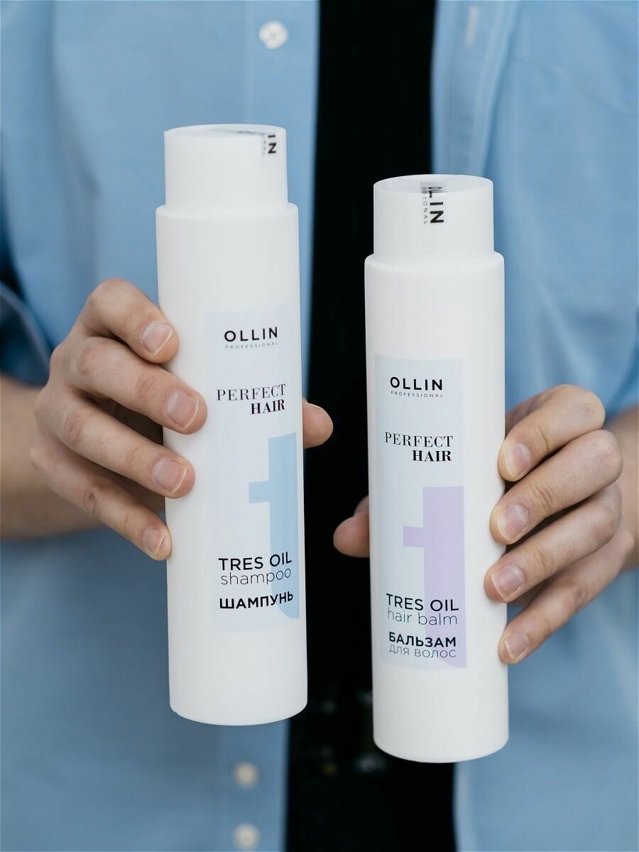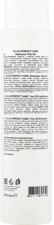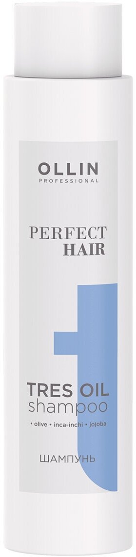 Бренд OLLIN - профессиональная косметика для волос Линия PERFECT HAIR - специализированные профессиональные продукты для всех типов волос. OLLIN PERFECT HAIR TRES OIL Шампунь - Густая жидкость белого цвета с освежающим запахом Восстанавливающий шампунь с маслом оливы, инка-инчи и жожоба для максимального питания и защиты волос. Бережно очищает, увлажняет и укрепляет кутикулярный слой, придает мягкость и здоровый блеск. Позволяет сохранить естественную красоту волос, наполняет их природной силой.
