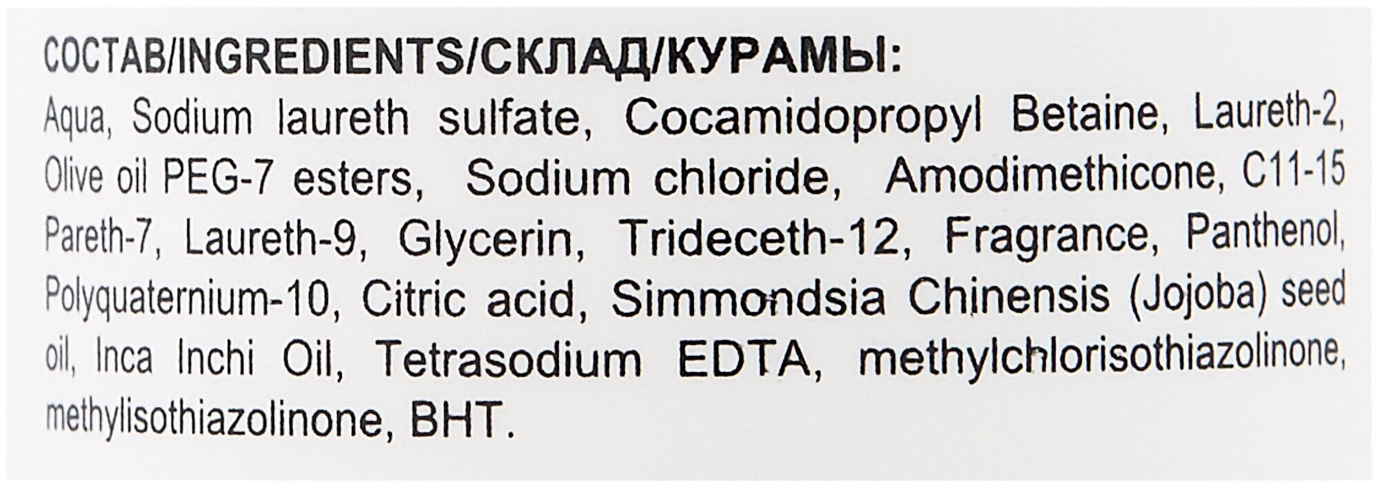Aqua, Sodium Laureth Sulfate, Cocamidopropyl Betaine, Laureth-2, Sodium chloride, Olive Oil Peg-7 Esters, Polyquaternium-10, Citric acid, Panthenol, Amodimethicone , C11-15 Pareth-7, Laureth-9, Glycerin, Trideceth-12, Parfum, Simmondsia Chinensis seed oil, Inca Inchi Oil, Tetrasodium EDTA, BHT, Methylchloroisothiazolinone, Methylisothiazolinone, Magnesium nitrate, Magnesium chloride