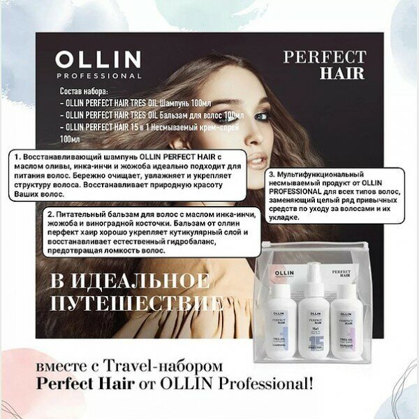 Комбинация специально отобранных активных компонентов и инновационных формул обеспечивает мгновенный восстанавливающий эффект и придает волосам необыкновенную красоту и очарование. В состав набора входит: Шампунь 100 мл; Бальзам 100 мл; Несмываемый крем-спрей 15 в 1 100 мл. Способ применения: шампунь: нанести на влажные волосы. Вспенить легкими массажными движениями. Тщательно смыть водой. Бальзам: нанести на влажные, вымытые шампунем волосы. Распределить по всей длине и оставить на 3-5 минут. Смыть водой. Крем-спрей: нанести на вымытые и подсушенные полотенцем волосы в необходимом количестве. Распределить продукт расческой по всей длине, включая кончики. Не смывая, приступить к укладке волос.