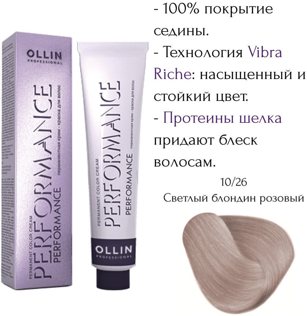 PERFORMANCE — крем-краска для волос, которая расширяет возможности мастера, делает процесс окрашивания проще и удобнее. Формула красителя гарантирует получение желаемого результата при окрашивании любой сложности. Уникальный состав красителя обеспечивает надежный уход за волосами и кожей головы, придает ослепительный блеск и сохраняет цвет до шести недель. Активные пигменты нового поколения и уникальная технология Vibra Riche обеспечивают получение насыщенного и стойкого цвета, а также 100% покрытия седины. Масляный купаж из экстрактов лекарственных трав устраняет раздражение и обеспечивает удивительно мягкое воздействие красителя на волосы и кожу головы. Входящие в состав гидролизованные протеины шелка придают волосам естественный блеск, который долго не тускнеет. Палитра Performance содержит 121 оттенков. Из них 102 оттенок основной палитры, 10 оттенков специальных блондинов и 9 корректоров.