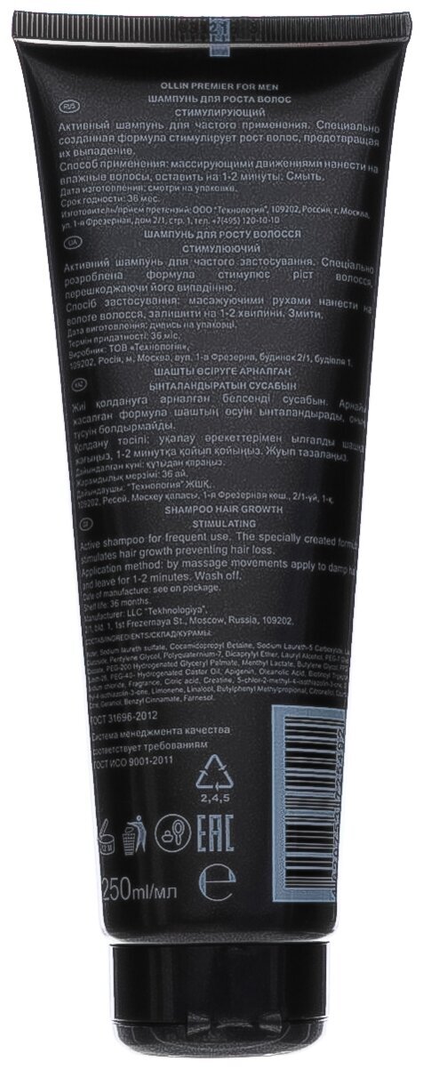 Шампунь стимулирующий для роста волос, для мужчин Shampoo Hair Growth Stimulating PREMIER FOR MEN - специальный шампунь для частого применения. Предотвращает выпадение волос и стимулирует их рост. Содержит специальные ухаживающие липиды, мягкий охлаждающий компонент. Обладает освежающим эффектом. Улучшает гидробаланс. Состав: Water, Sodium laureth sulfate, Cocamidopropyl Betaine, Sodium Laureth-5 Carboxylate, Lauryl Glucoside, Pentylene Glycol, Polyquaternium-7, Dicaprylyl Ether, Lauryl Alcohol, PEG-7 Glyceryl Cocoate, PEG-200 Hydrogenated Glyceryl Palmate, Menthyl Lactate, Butylene Glycol, PPG-26, Buteth-26, PEG-40- Hydrogenated Castor Oil, Apigenin, Oleanolic Acid, Biotinoyl Tripeptide-1, Sodium chloride, Fragrance, Citric acid, Creatine, 5-chlor-2-methyl-4-isothiazolin-3-one, 2-methyl-4-isothiazolin-3-one, Limonene, Linalool, Butylphenyl Methylpropional, Citronellol, Coumarin, Citral, Geraniol, Benzyl Cinnamate, Farnesol. Активные