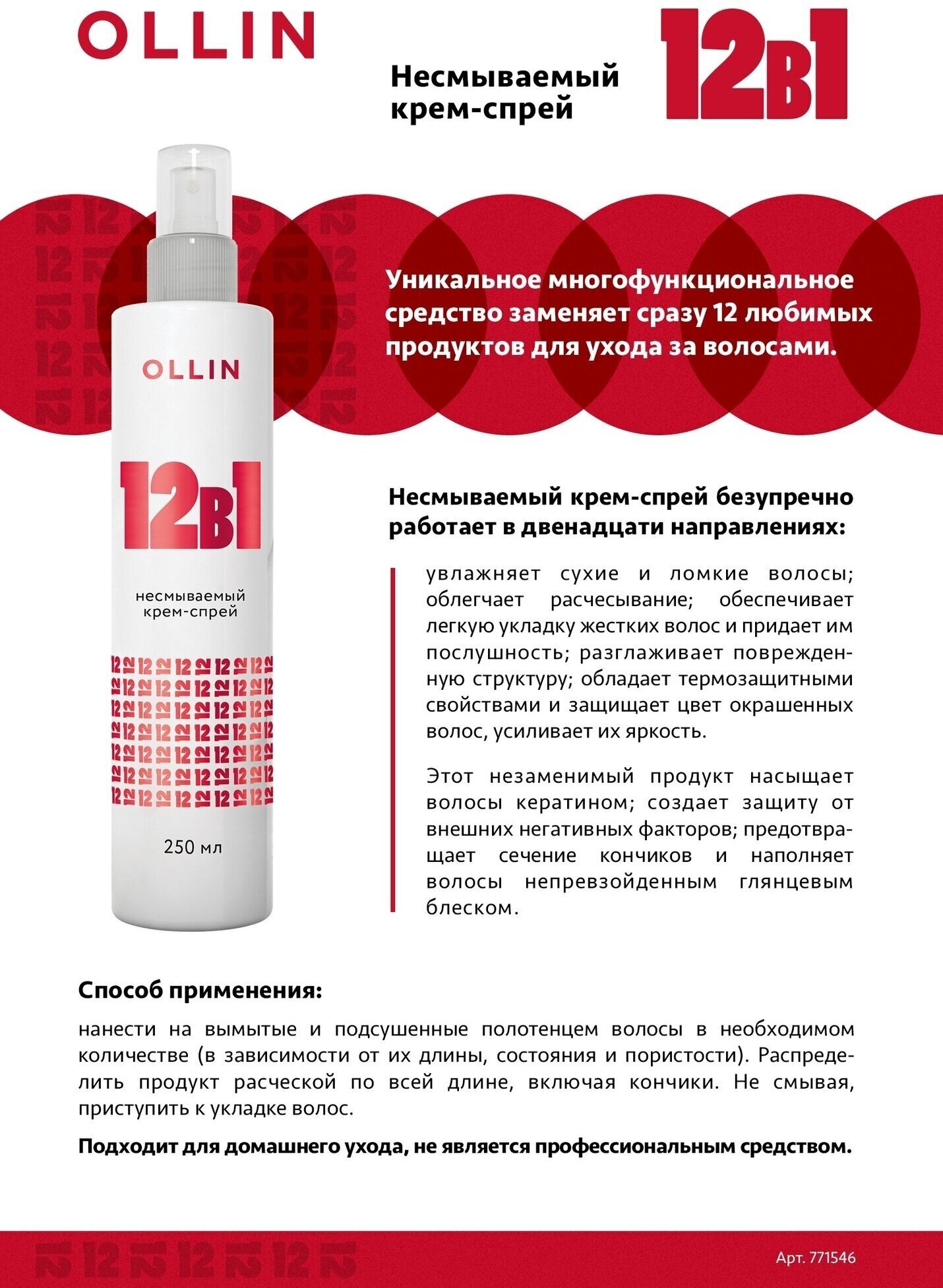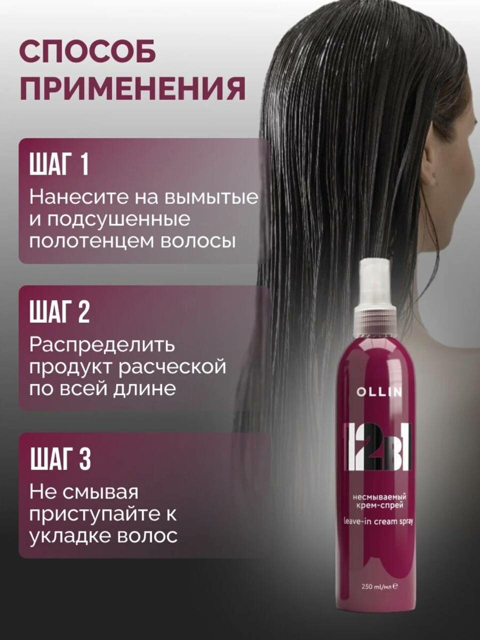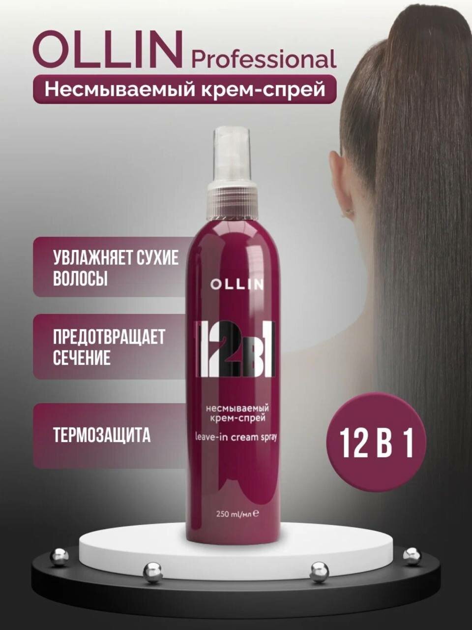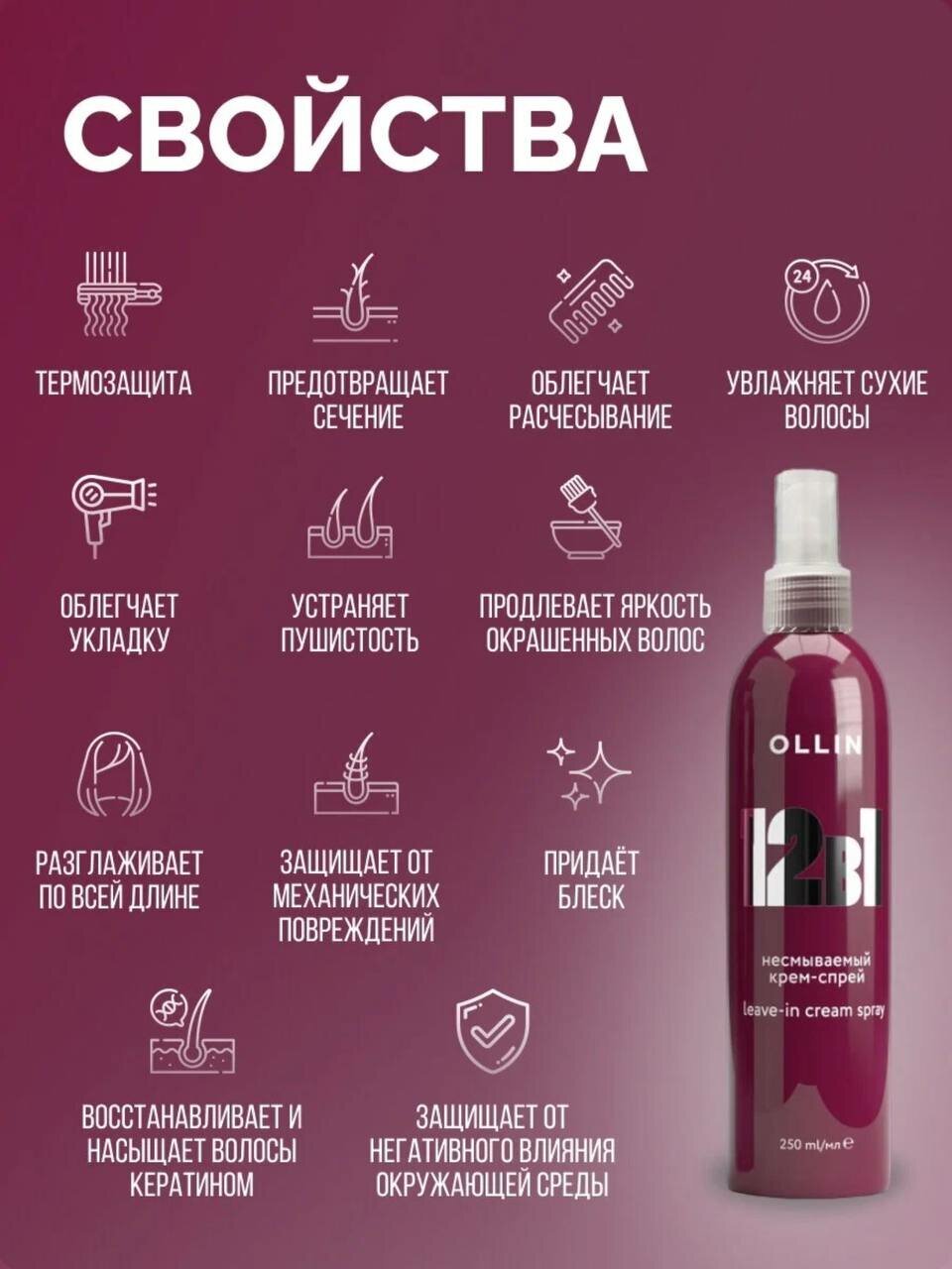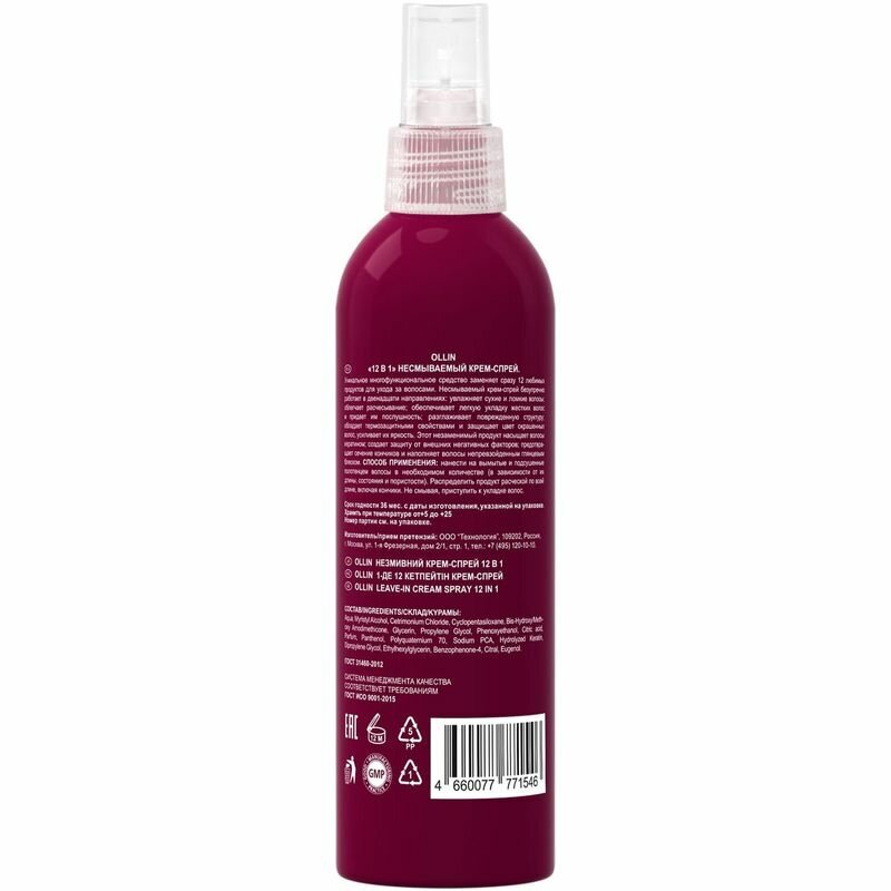 В одной косметичке 12 продуктов ухода - это вполне реально, если все они лишь в одном средстве! Несмываемый крем-спрей 12в1 OLLIN работает сразу в нескольких направлениях: увлажняет сухие волосы, облегчает расчесывание, разглаживает поврежденную структуру, придает им ослепительный блеск, обладает отличной термозащитой и сохраняет цвет окрашенных волос. Многофункциональное средство насыщает волосы кератином и защищает их от вредного воздействия окружающей среды, предотвращает сечение кончиков и усиливает яркость цвета, а также гарантирует легкую укладку и даже жесткие волосы превращает в послушные. 12 непревзойденных функций в арсенале одного продукта!