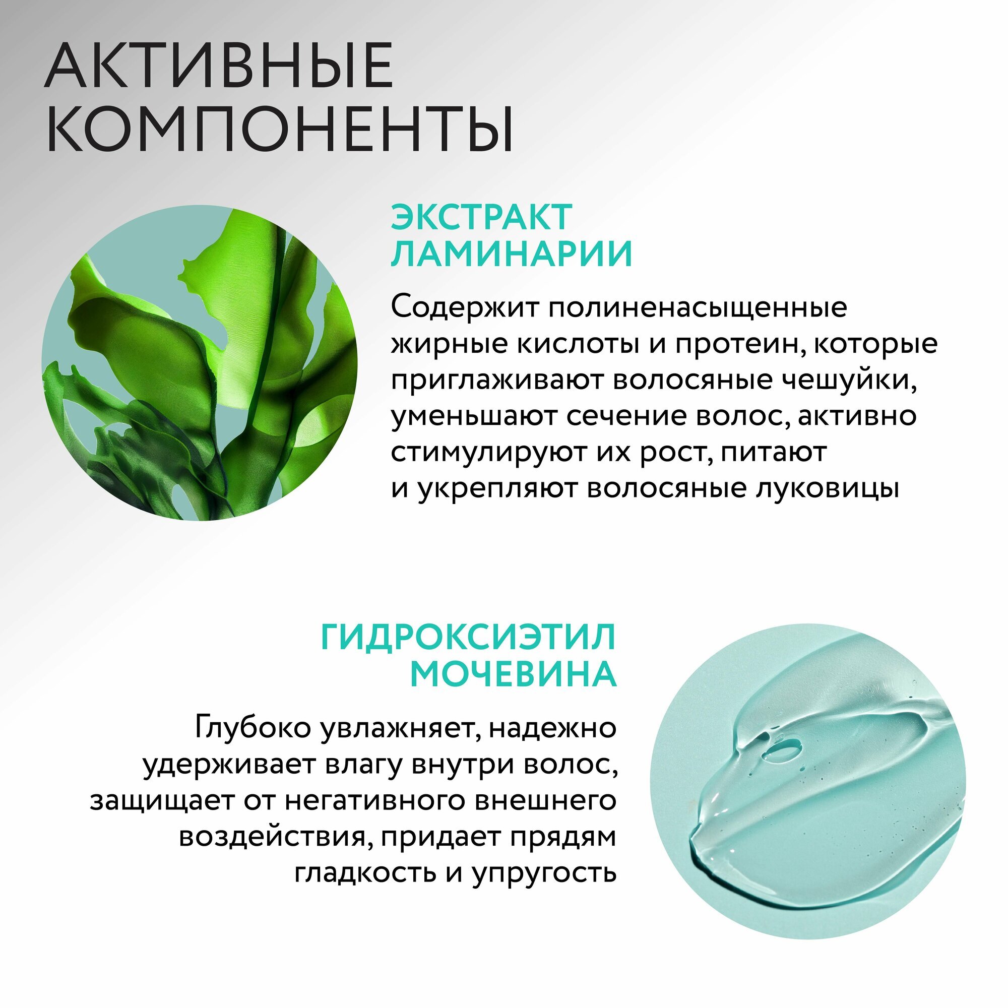 В состав кондиционера входят активные ингредиенты, такие как морские водоросли и гидроксиэтилмочевина.