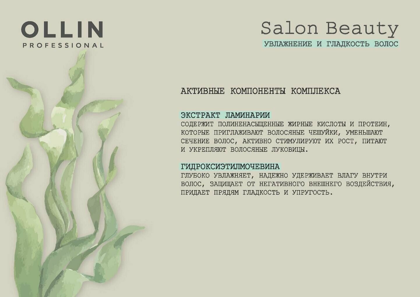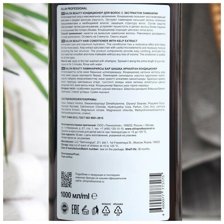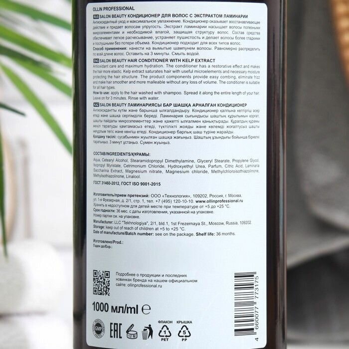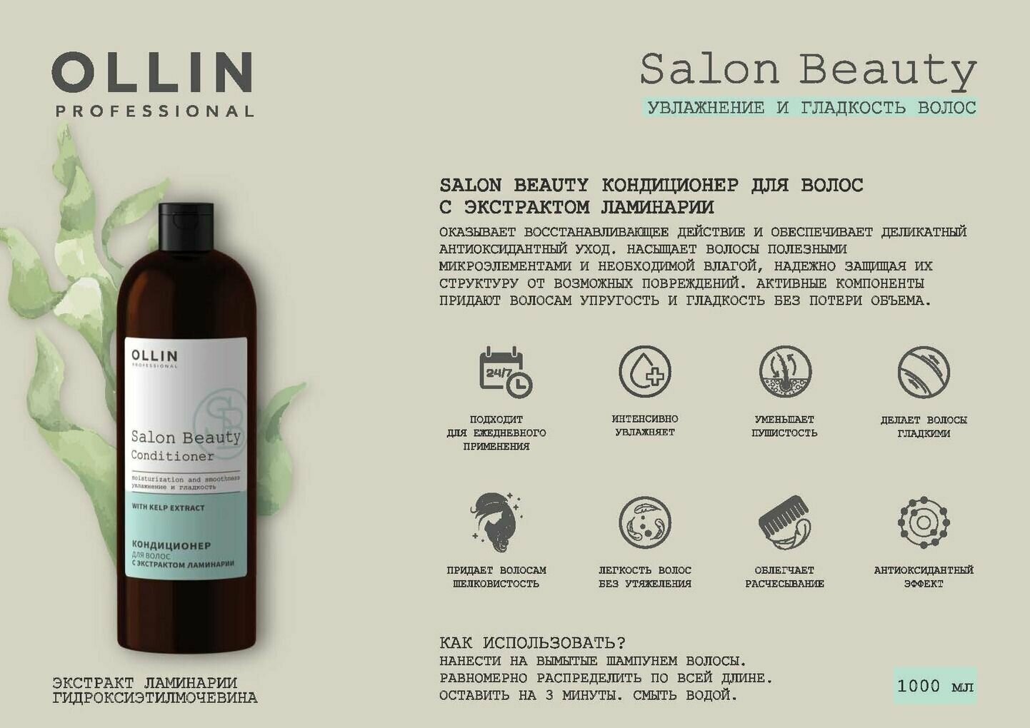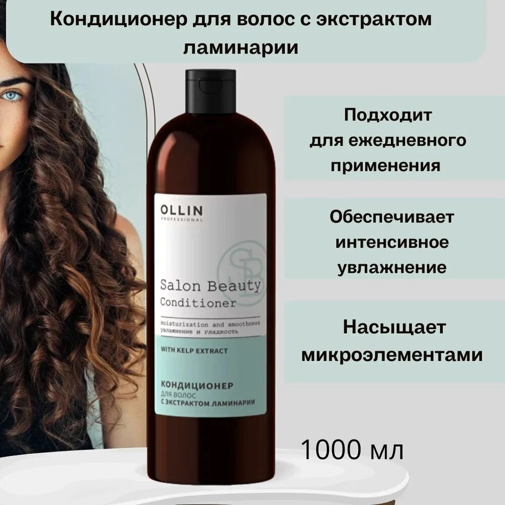 Кондиционер для волос OLLIN PROFESSIONAL SALON BEAUTY с экстрактом ламинарии 1000мл - это профессиональное средство для глубокого увлажнения и защиты волос.