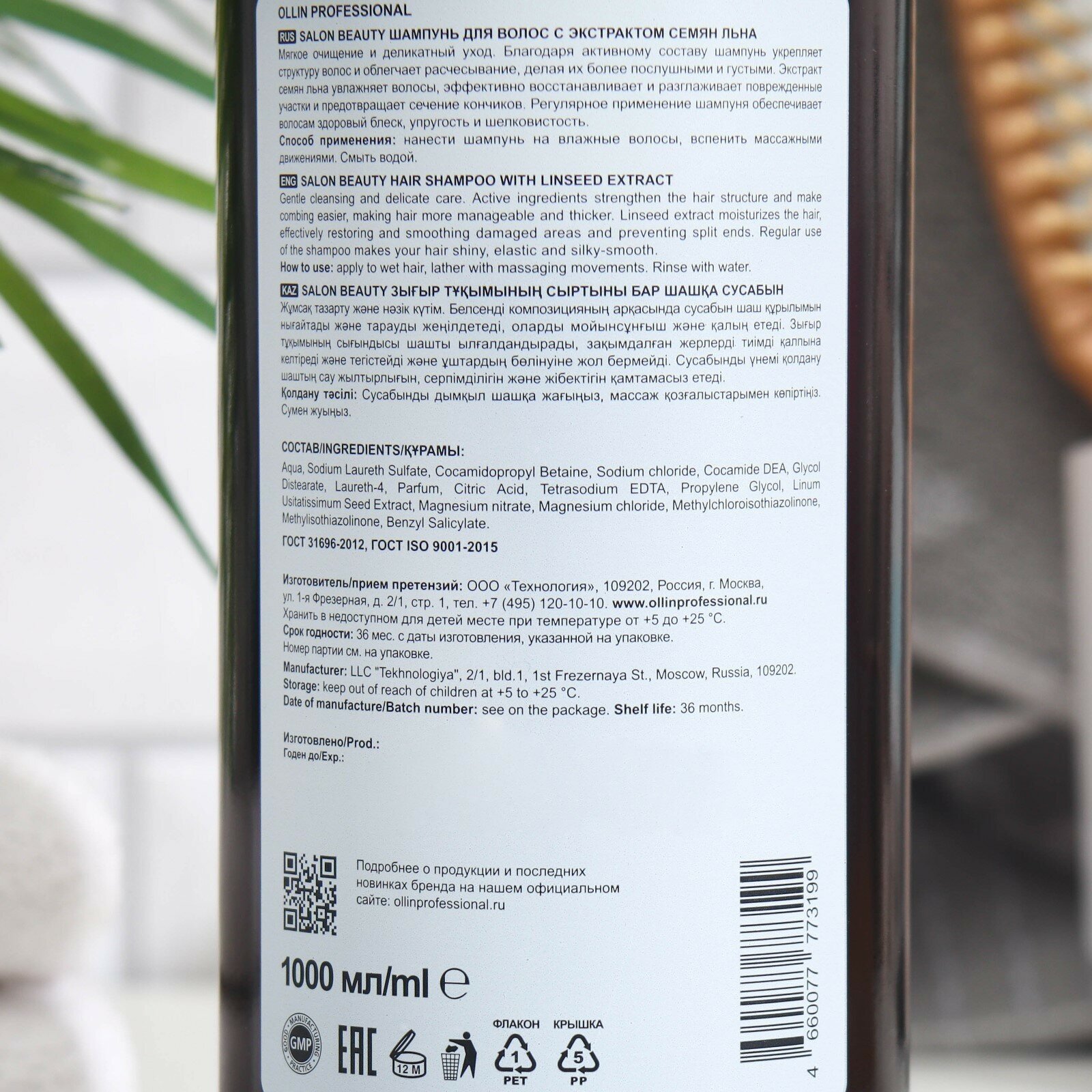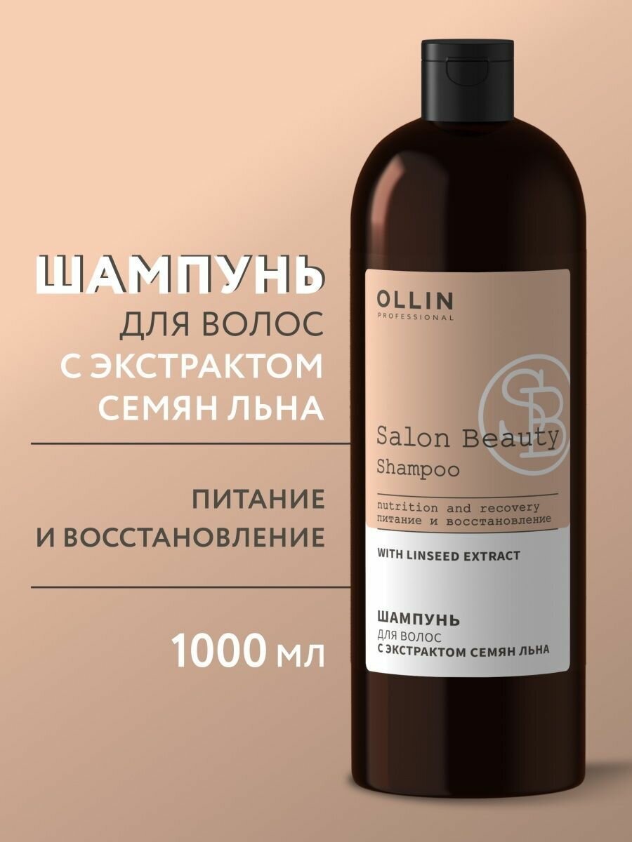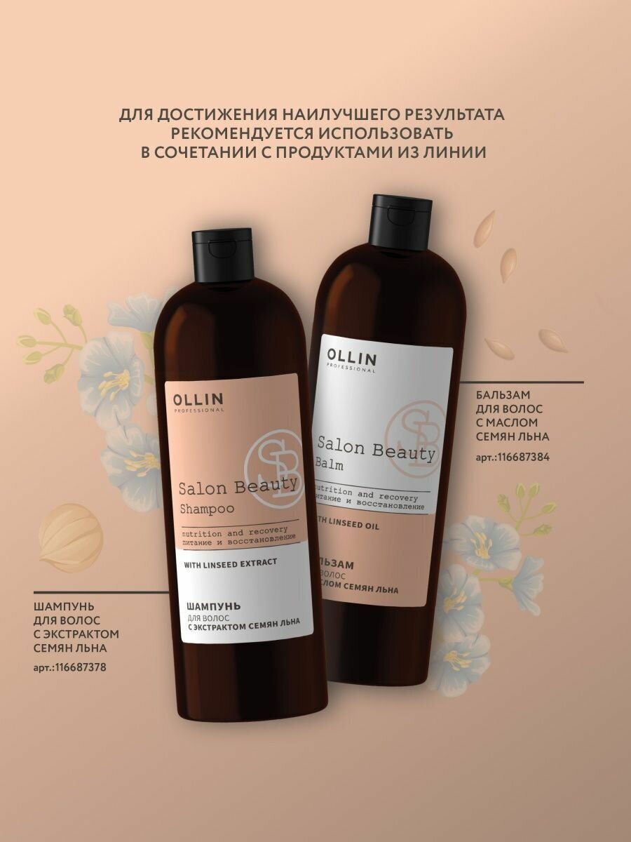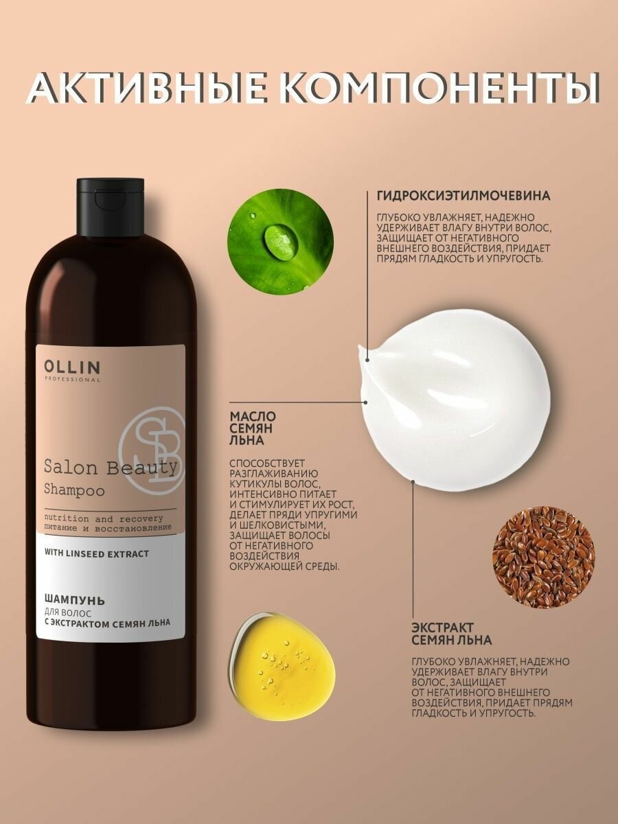 Шампунь салон бьюти от оллин с экстрактом семян льна способствует разглаживанию кутикулы волос, интенсивно питает и стимулирует их рост, делает пряди упругими и шелковистыми, защищает волосы от негативного воздействия окружающей среды.