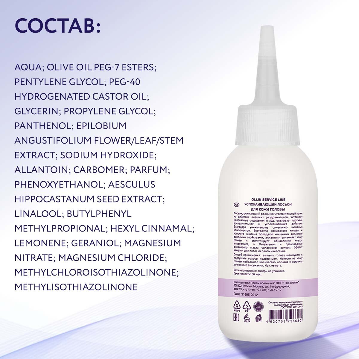 Успокаивающий лосьон для кожи головы OLLIN SERVICE LINE - это профессиональное средство, разработанное специально для чувствительной кожи головы. Объем составляет 100 мл, что делает его удобным для использования в домашних условиях.