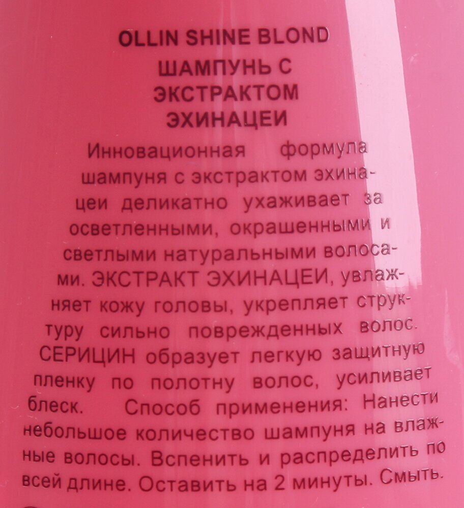 Линия Shine Blond создана специально для обесцвеченных, осветленных и натуральных светлых волос. Ее активные компоненты восстанавливают волосы, насыщают их питательными веществами и придают им естественный блеск. Экстракт эхинацеи содержит большое количество полисахаридов, которые стимулируют иммунитет, а гидролизованный кератин восстанавливает поврежденные участки и делает волосы более гладкими.