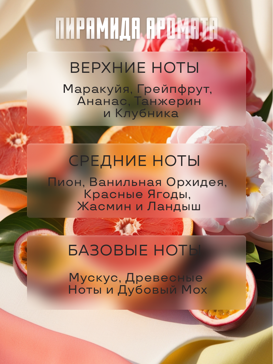 Аромат отдушки включает в себя ноты грейпфрута, маракуйи и пиона, создавая свежий и яркий запах.