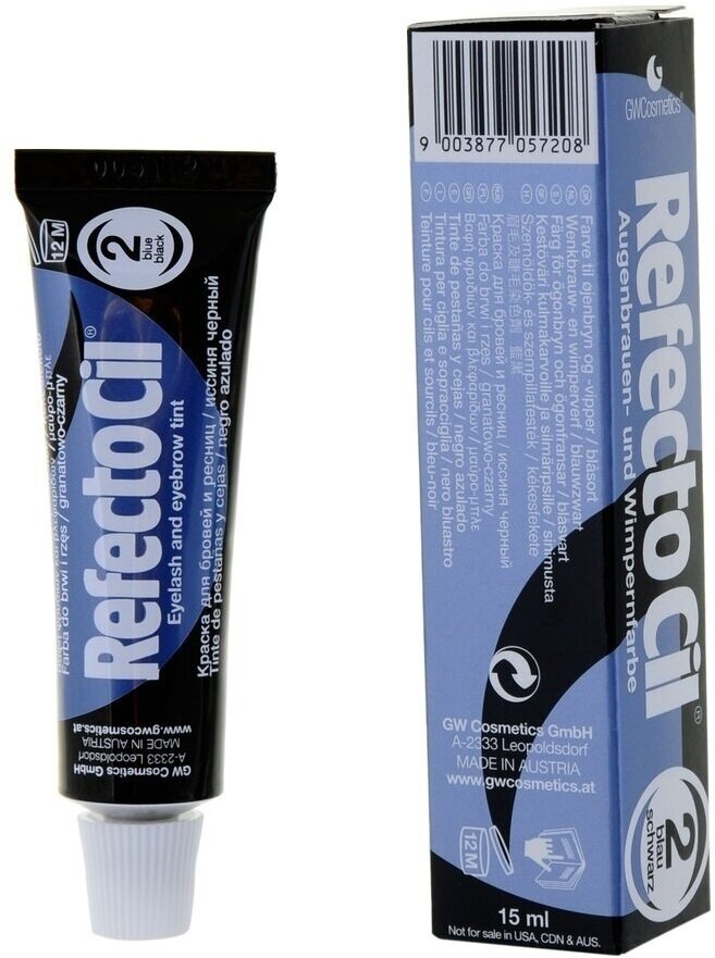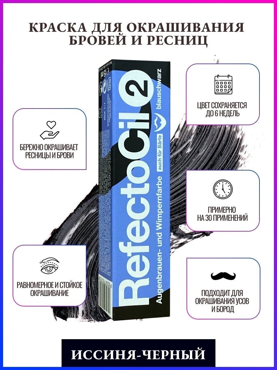 Краска RefectoCil №2 Иссине-черная придает бровям и ресницам глубокий насыщенный черный цвет с синим отблеском. Делает глаза особенно выразительными, а ресницы визуально объемнее и длиннее. Одного тюбика 15 мл хватает примерно на 30 окрашиваний.