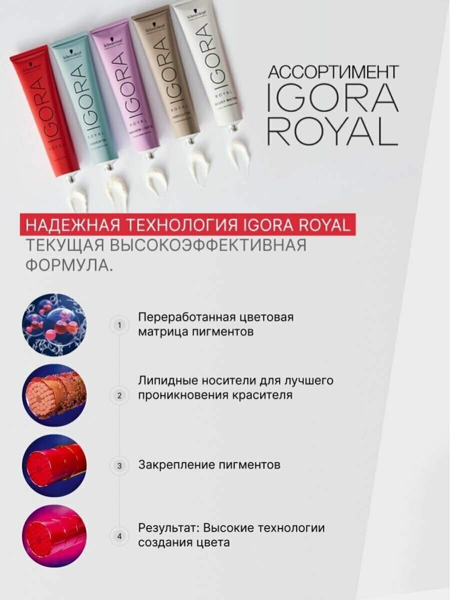 Краска работает только с окислителем Igora Royal, который приобретается отдельно. Смешивается со всеми оттенками IGORA ROYAL. Улучшенный уход достигается с использованием масляного окислителя 12% / 40 Vol. IGORA ROYAL.