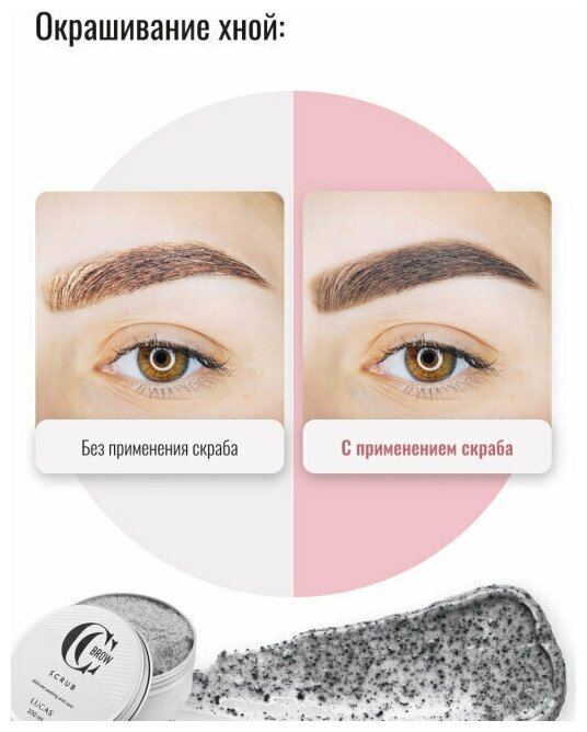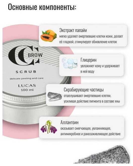 Скраб для бровей позволяет оказать более глубокое воздействие красящих веществ на кожу, что в свою очередь дает более насыщенный и стойкий оттенок. Средство удаляет отмершие клетки кожи и способствует ее обновлению, тщательно очищая от лишней грязи, скапливающейся на поверхности и забивающейся в поры, что способствует доступу кислорода, лучшему проникновению красящего пигмента в составе хны. Рекомендуется применять перед нанесением хны для бровей. Без резкого запаха. Применение: Нанесите скраб под и над бровью, а после пальцем перенесите по периметру всей брови. Делайте массаж скрабом вокруг брови, потом переходите на саму бровь. Выполняйте массаж мягкими круговыми движениями. Не нужно сильно давить и тереть. Делайте скрабирование в течении 2-х минут на каждой брови. Смойте скраб водой. Срок годности 36 месяцев, после вскрытия - 24 месяца. Активы: папаин - мягко удаляет отмершие клетки, делает кожу гладкой, стимулирует обновление клеток глицерин - удерживает влагу в коже Biodtox - снимает воспаление и восстанавливает кожу аллантоин - оказывает смягчающее, увлажняющее, антимикробное и ранозаживляющее действие, стимулирует обновление клеток скрабирующие частицы - механически при массаже отшелушивают верхний слой ороговевших клеток эпителия, тщательно очищая кожные покровы от лишней грязи, скапливающейся на поверхности и забивающей в поры, способствует доступу кислорода и лучшему проникновению красящего пигмента в составе хны Состав: вода, глицерилстеарат, цетеариловый спирт, глицерин, минеральное масло, этилгексилстеарат, полиэтилен, кукурузное масло, гликолевая кислота, цетеарет-20, гидроксид натрия, цетеарет -12, цетилпальмитат, пропандиол, экстракт папайи, масло растительное, метилпарабен, ксантановая камедь, масло миндаля сладкого, аллантоин, пропилпарабен, D-пантенол, пропиленгликоль, тетранатриевая соль эдта, бутилгидрокситолуол, отдушка ъ листьев алоэ барбаденсис экстракт, биофлавоноиды, брокколи экстракт