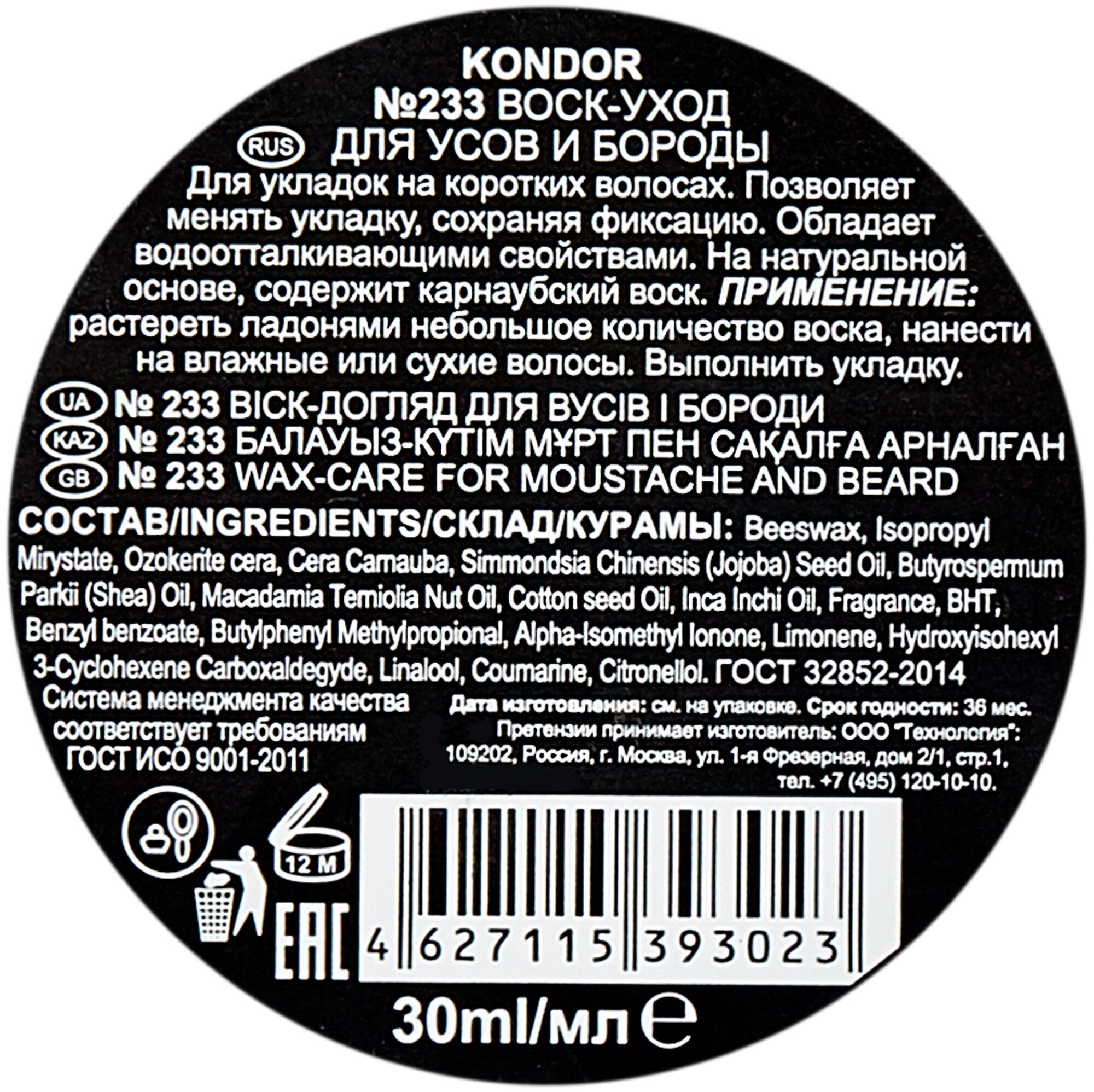 Продукт содержит хлопковое масло и карнаубский воск, которые смягчают и увлажняют щетину, обеспечивая надежную укладку.