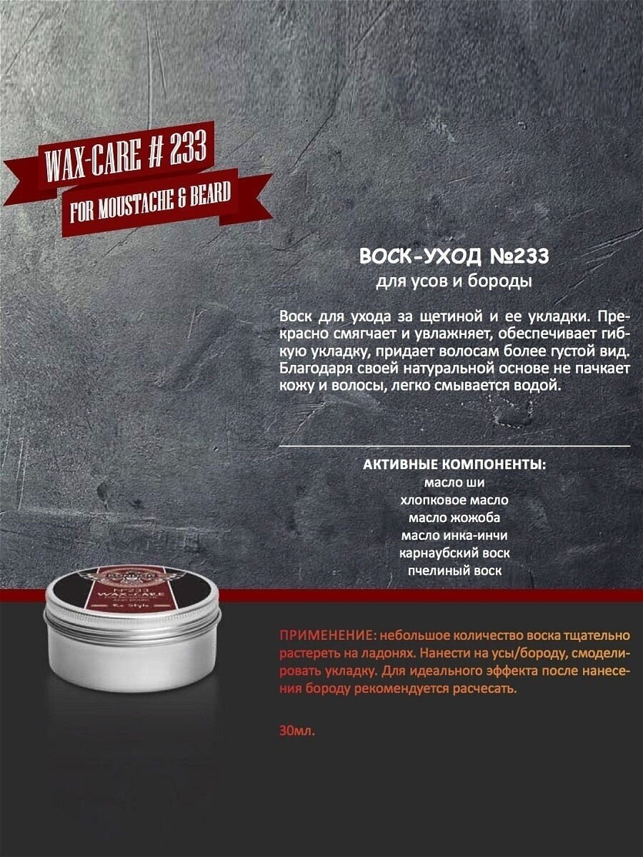 Воск обеспечивает надежную укладку бороды, смягчает и увлажняет щетину, придавая ей естественный блеск. Благодаря этому, вы сможете моделировать усы по своему желанию.